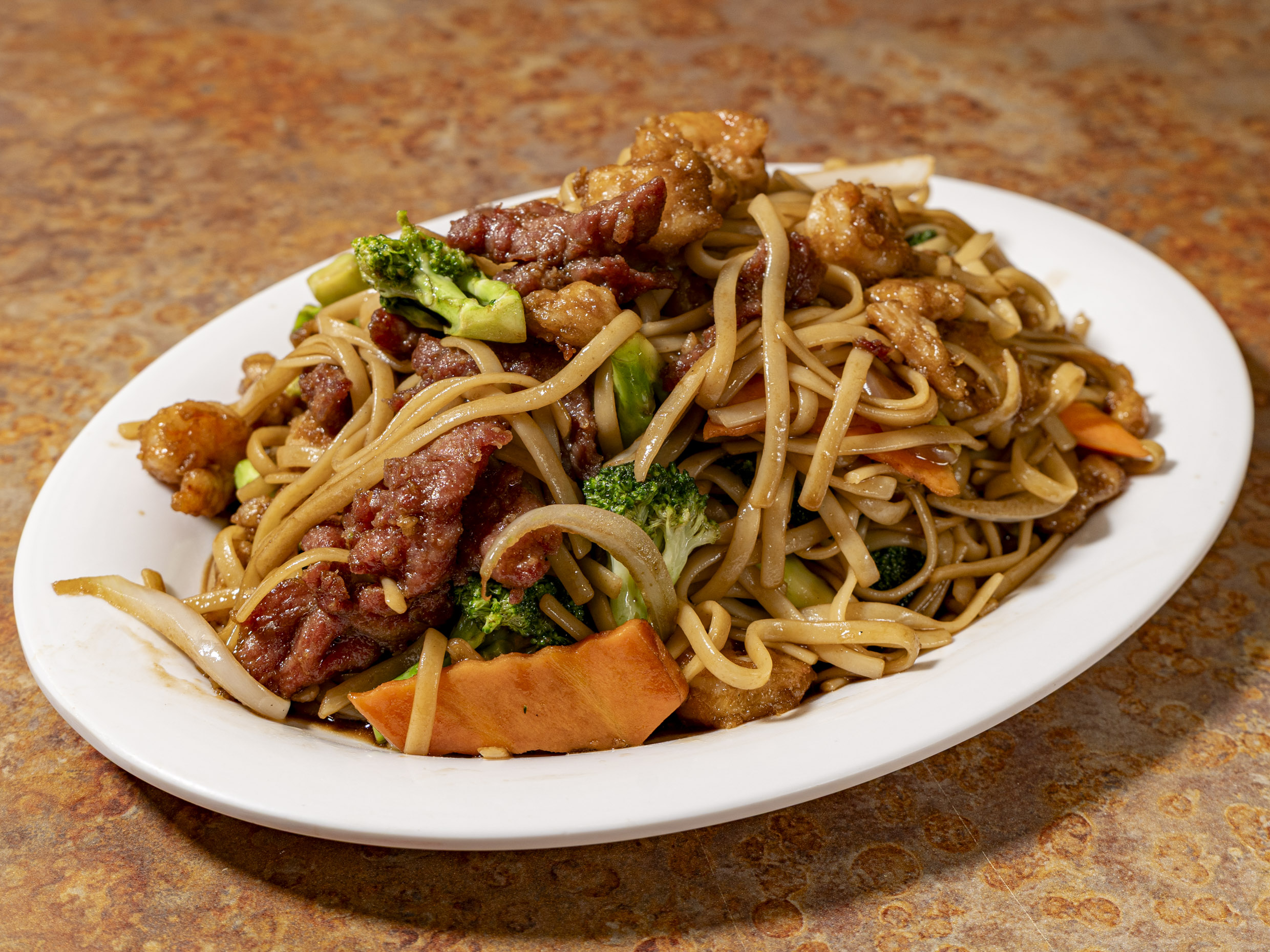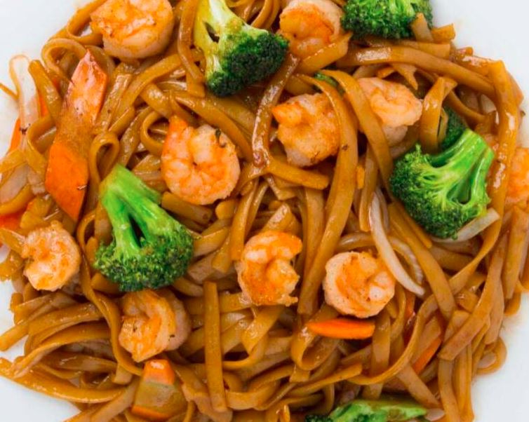 Camarón, res, pollo, brócoli, zanahoria, cebolla, tallarines en salsa.