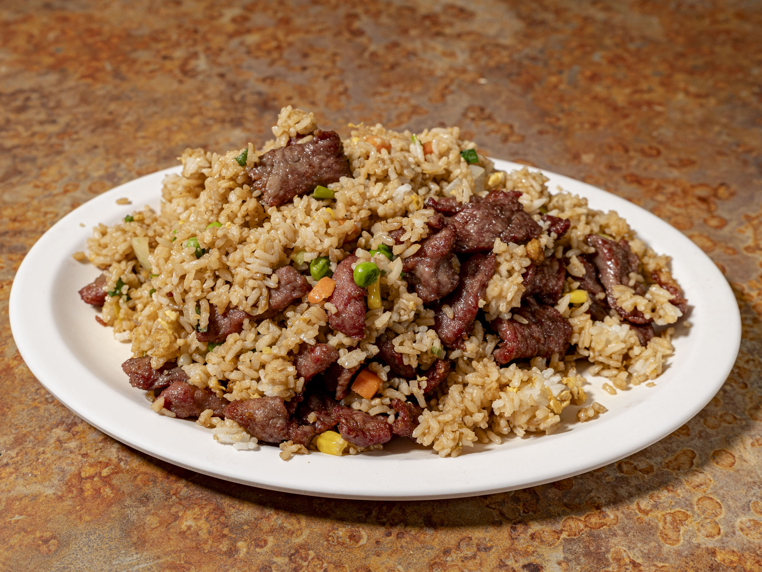 Arroz frito con zanahoria, elote, chícharo y cebollín, res.