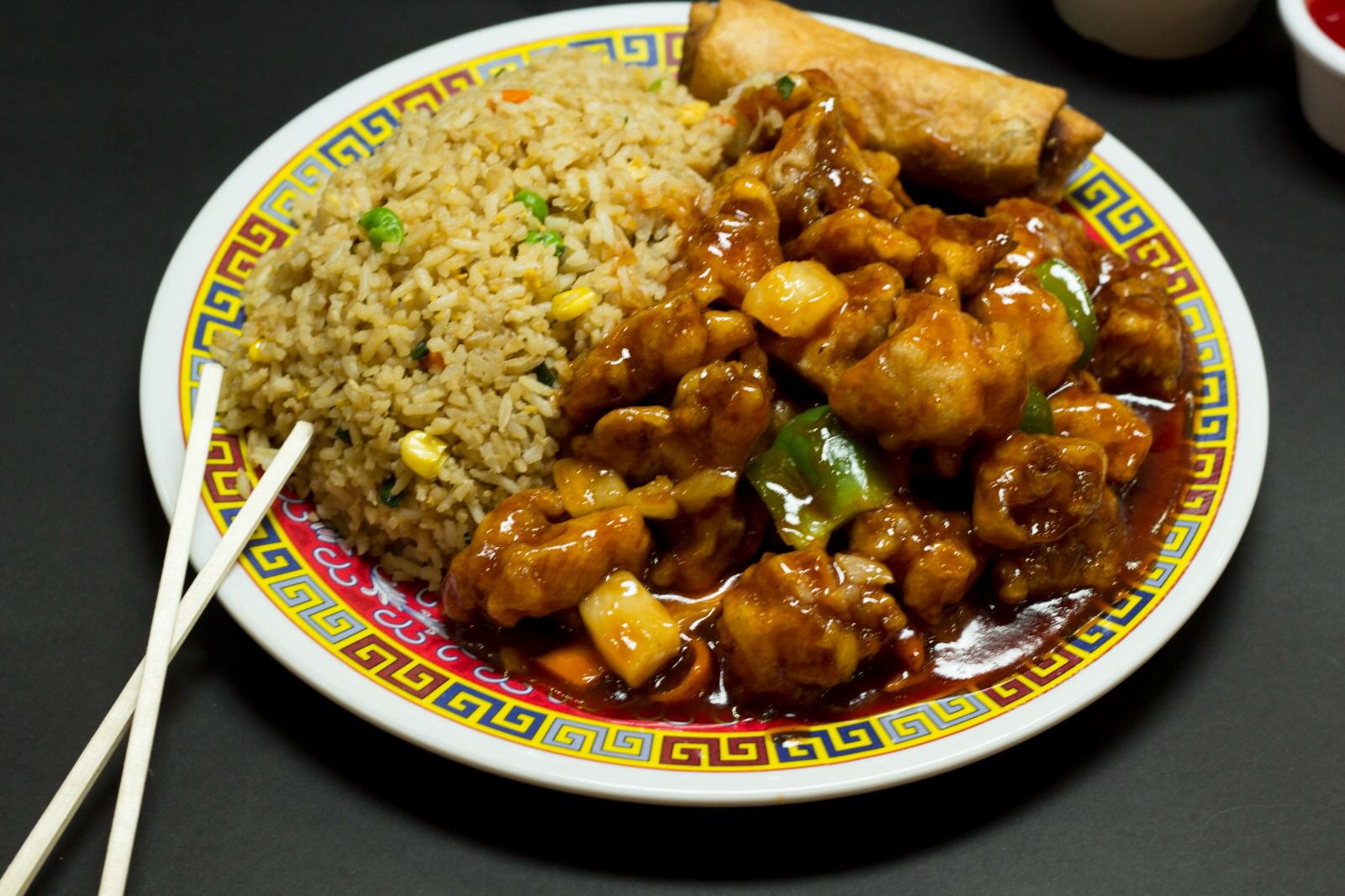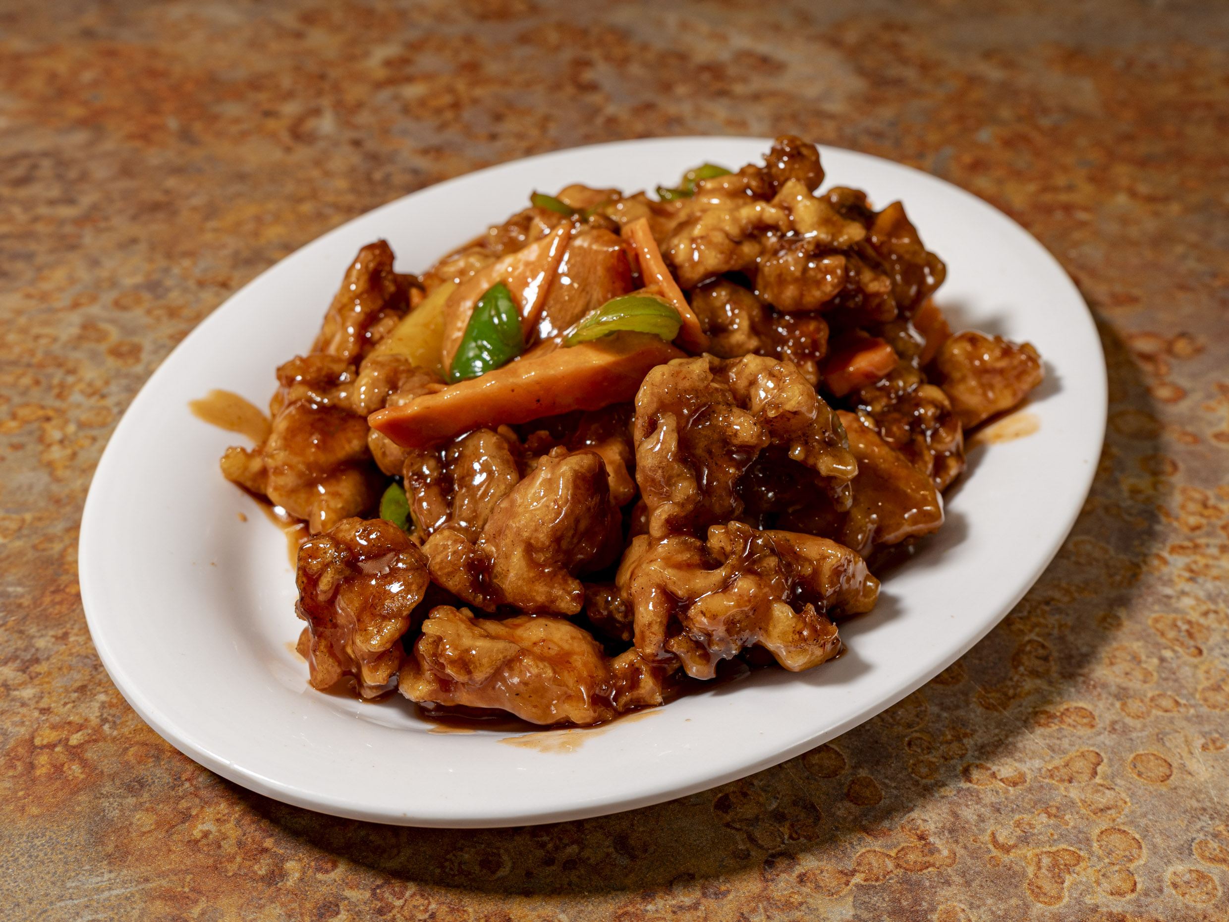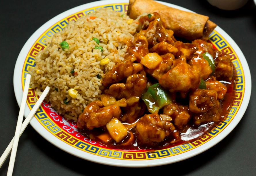 Pollo frito empanizado sin hueso, poco pimiento, zanahoria y piña en salsa agridulce.