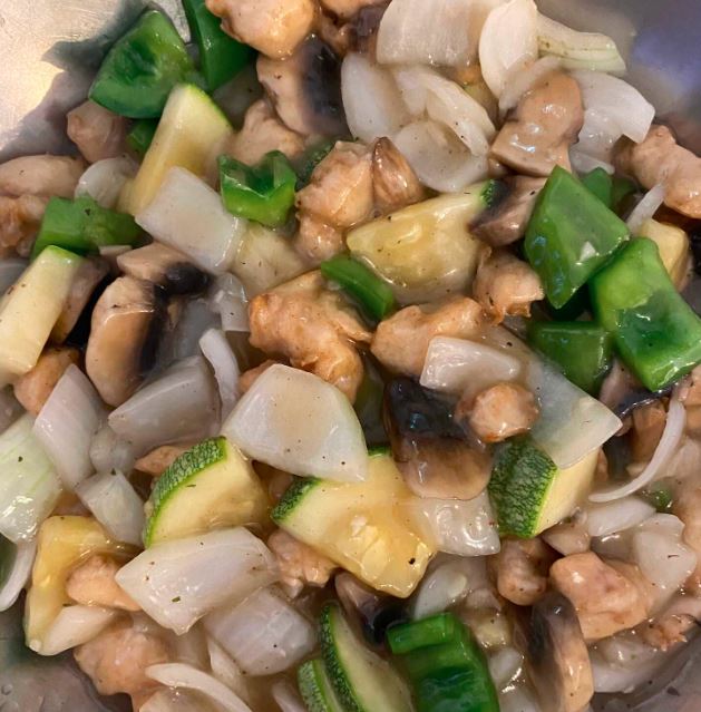 Pollo, hongo chino, champiñón, cebolla, zanahoria, pimiento y chile jalapeño.