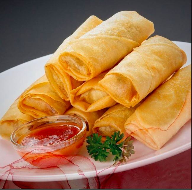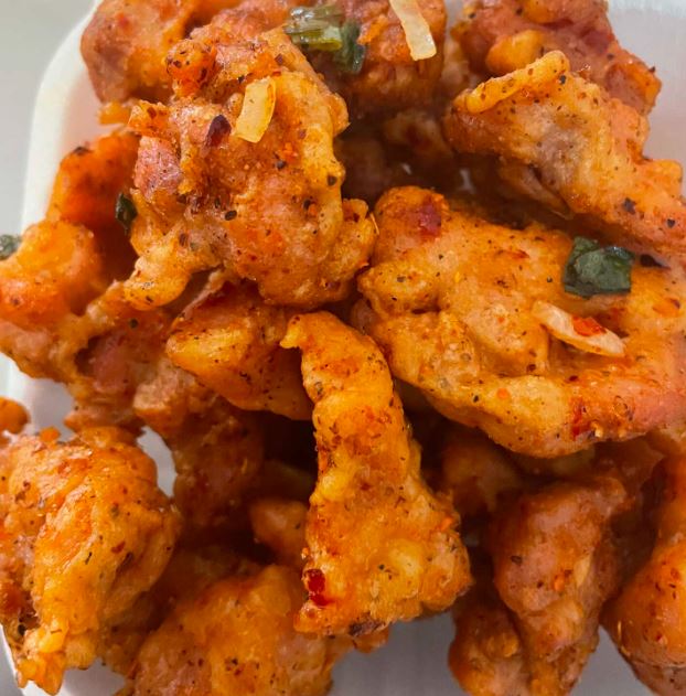 Camarón capeado con pimiento morrón, cebollina y zanahoria sazonado con pimienta y especies orientales.