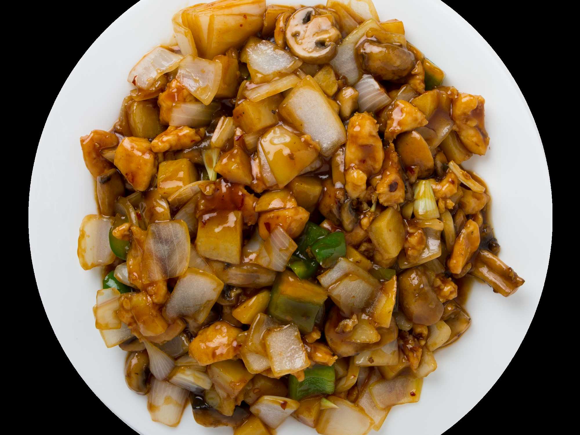 Pollo, hongo chino, champiñón, cebolla, zanahoria, pimiento y chile jalapeño.