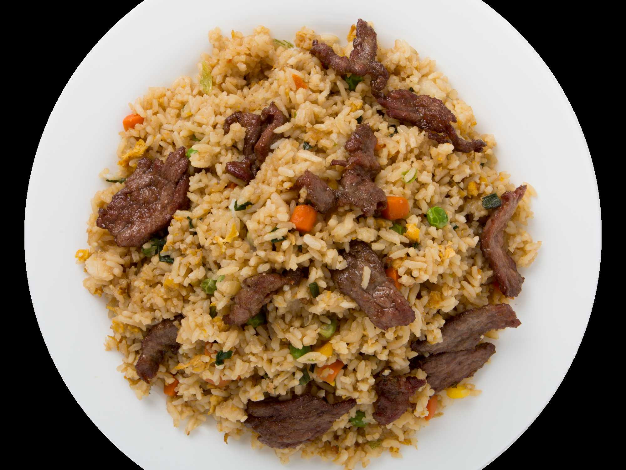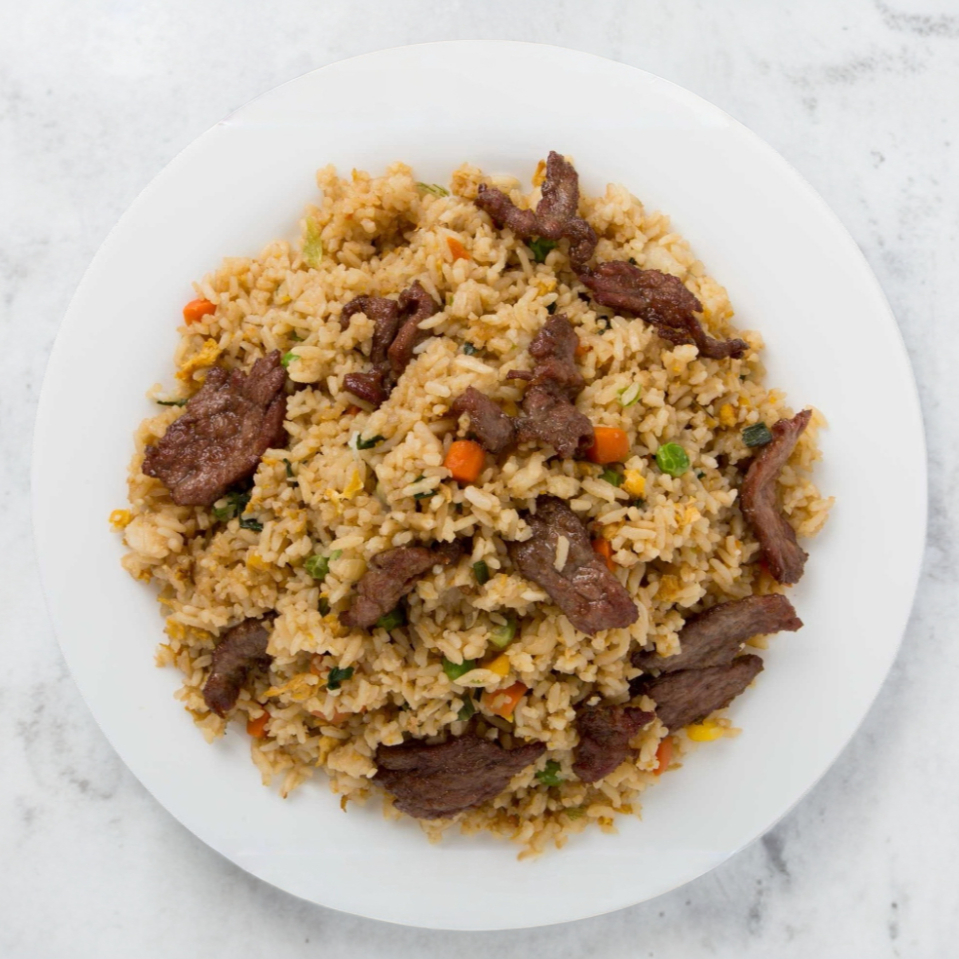 Arroz Frito con zanahoria, elote, chicharo y cebollina, res