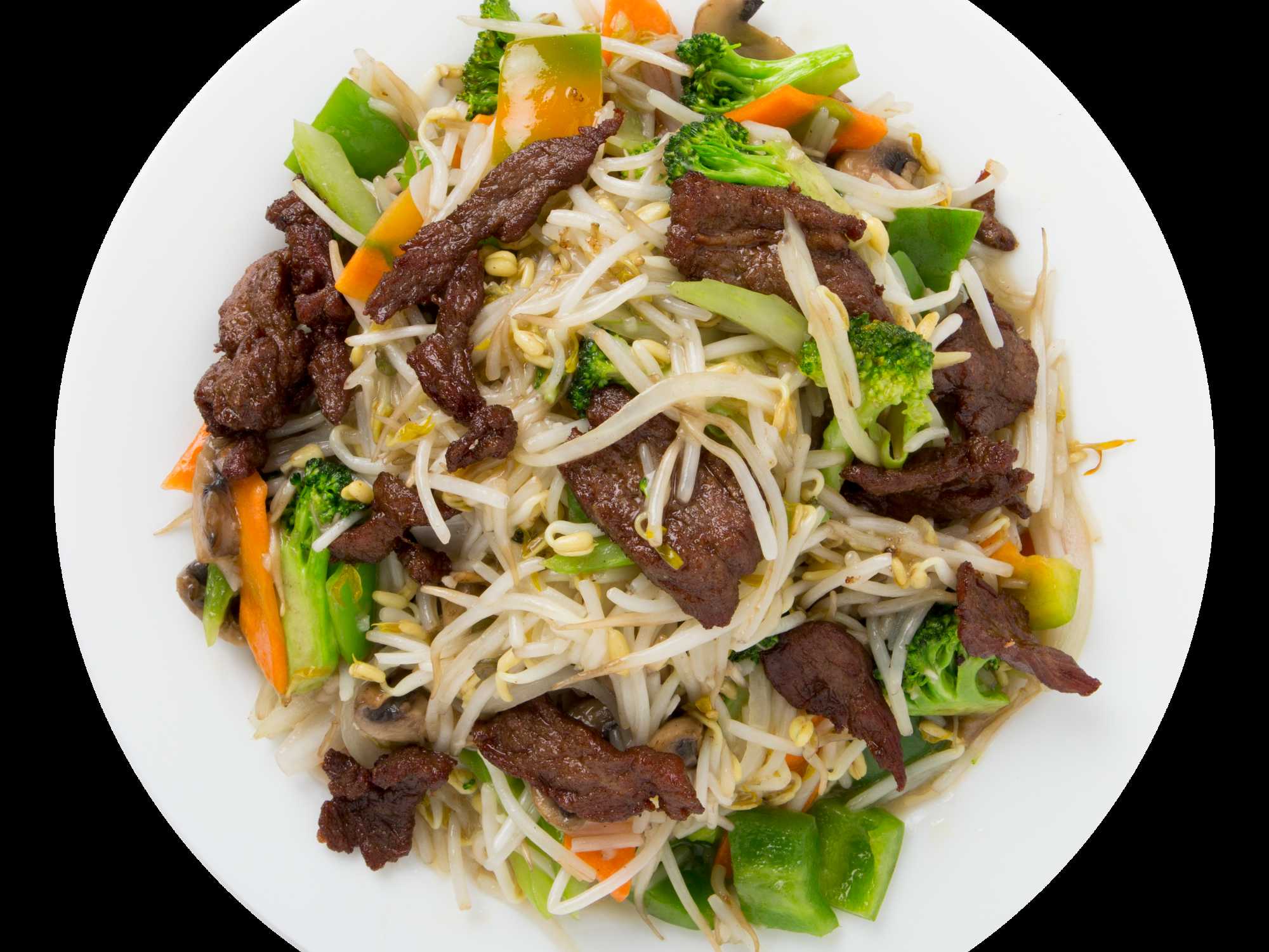 Camarón, pollo y res, fideo chino cristalino, brócoli, zanahoria, cebolla en salsa natural.