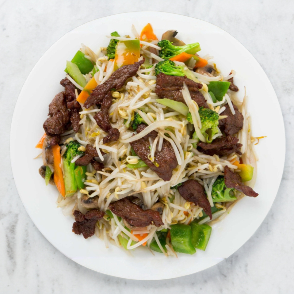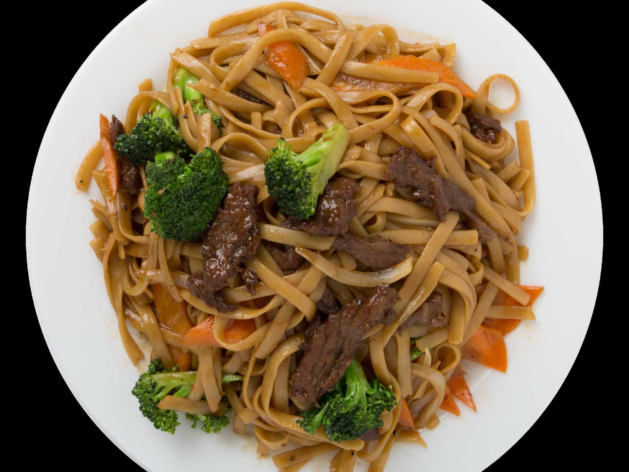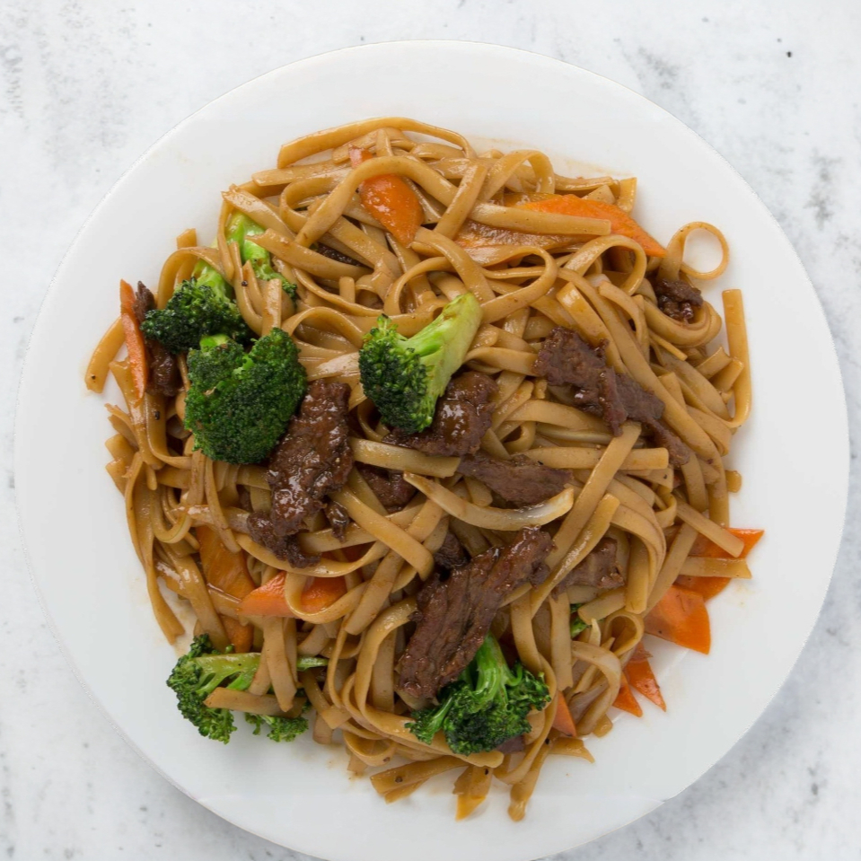 Brócoli, zanahoria, cebolla, res y tallarín en salsa oscura.