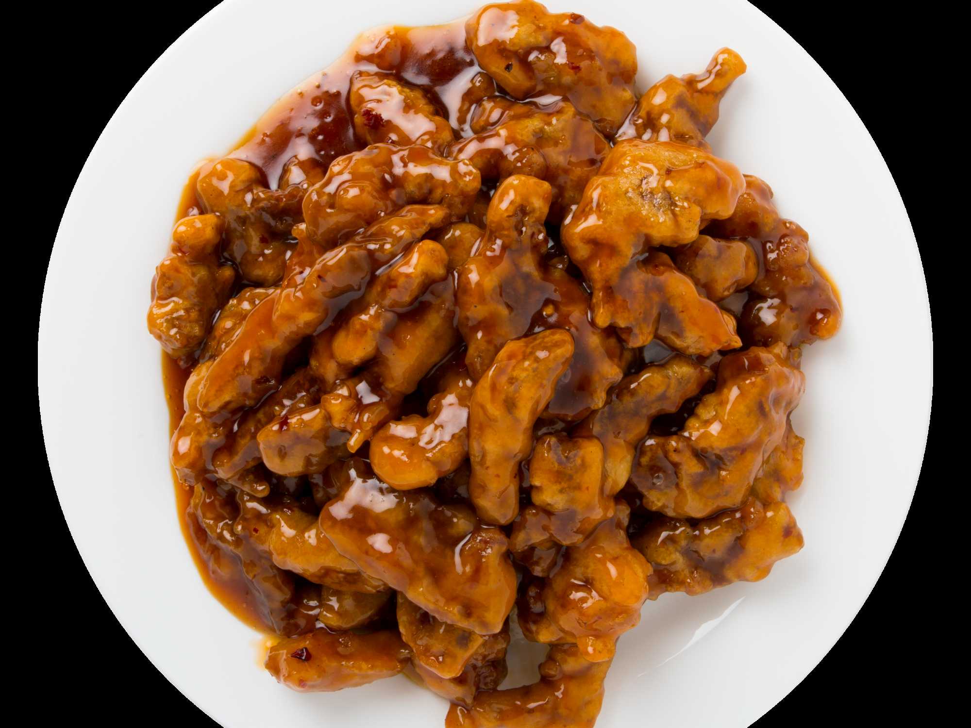 Res frita empanizada en salsa agridulce picante sabor a naranja.