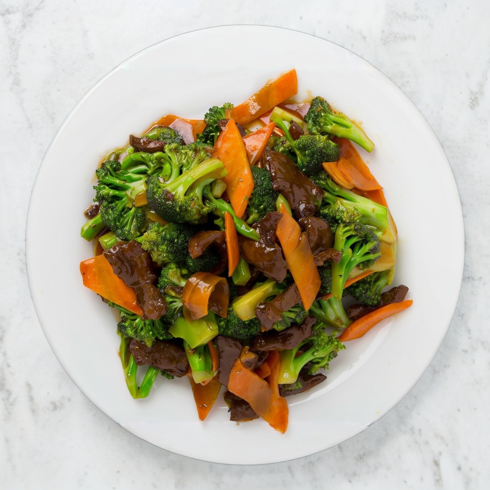 Brócoli, zanahoria, cebolla, res y tallarón en salsa oscura.