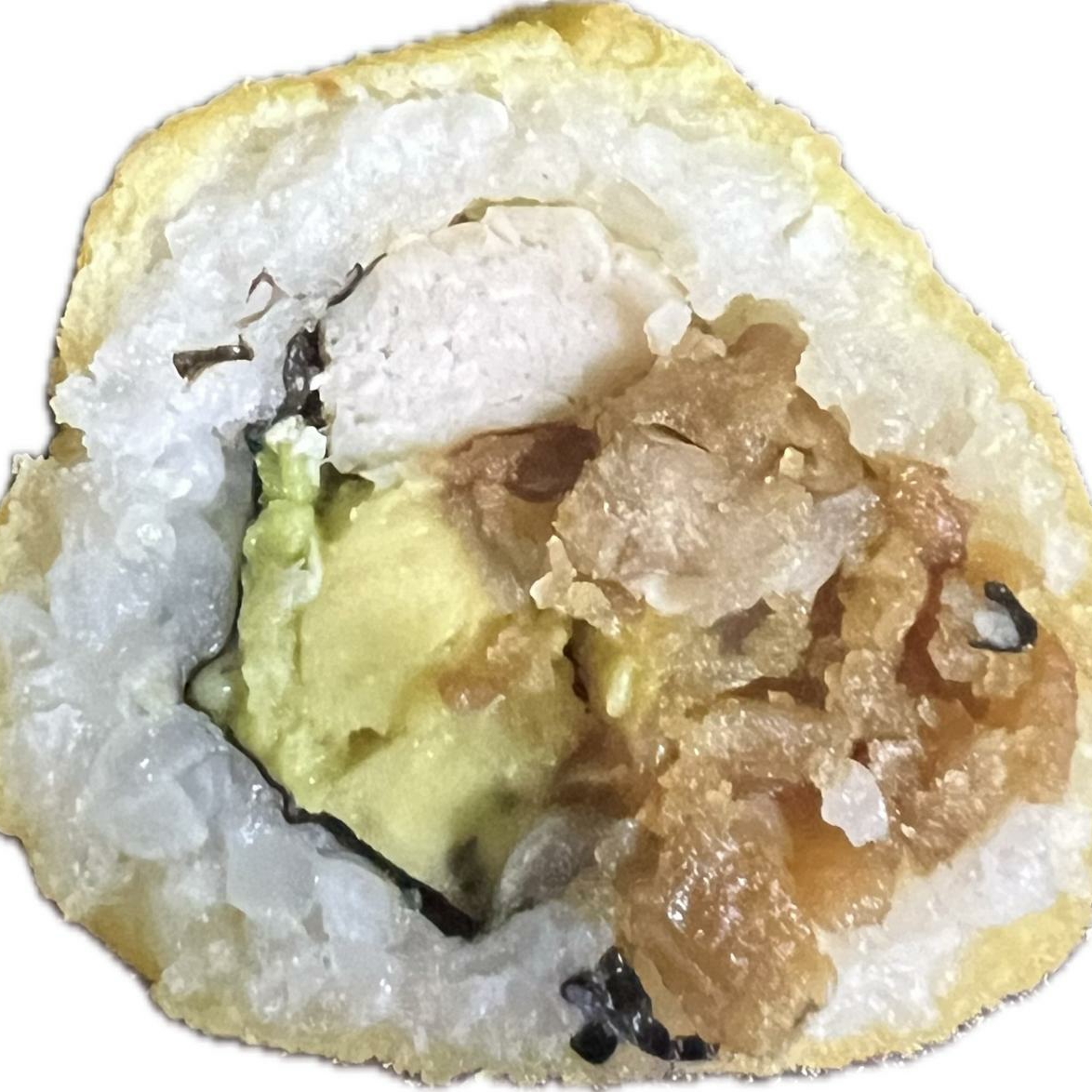 Relleno de Camarón Empanizado, Queso Crema, Tampico, Cebolla Frita, Aguacate y por encima Furikake.