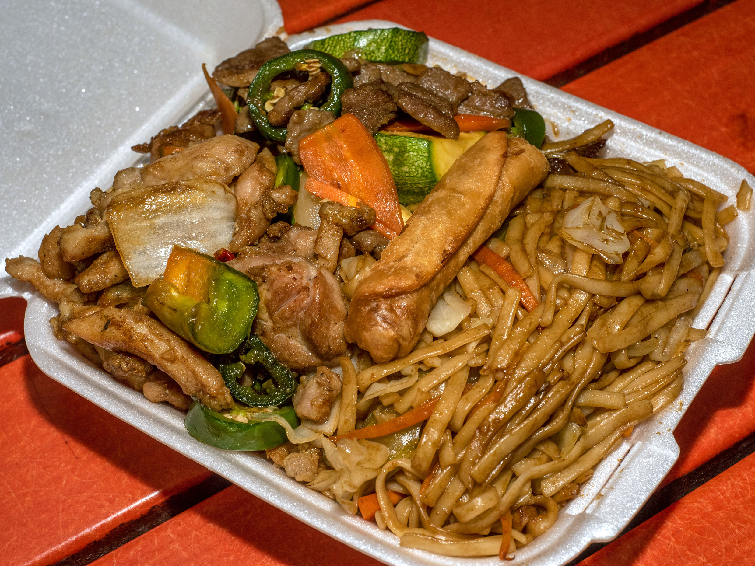 Combo mediano arroz frito con 3 de tus guisos favoritos de res, pollo o puerco