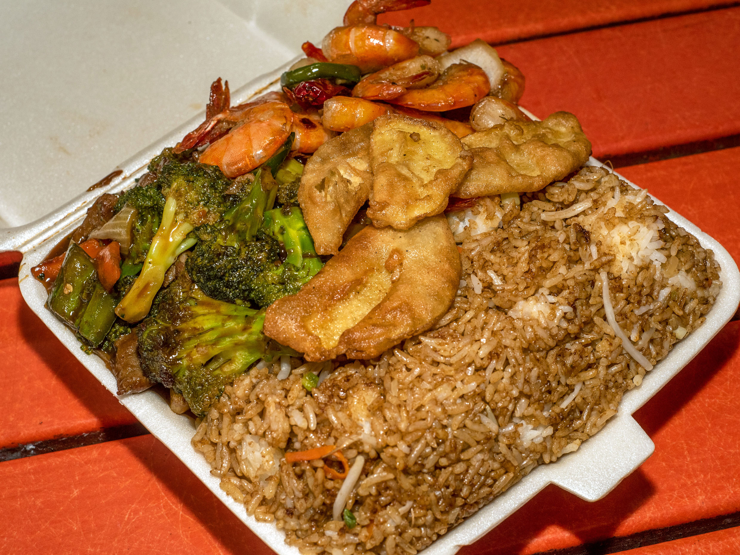 Combo mixto grande arroz frito con un guiso favorito de res, pollo o puerco y un guiso de camarón