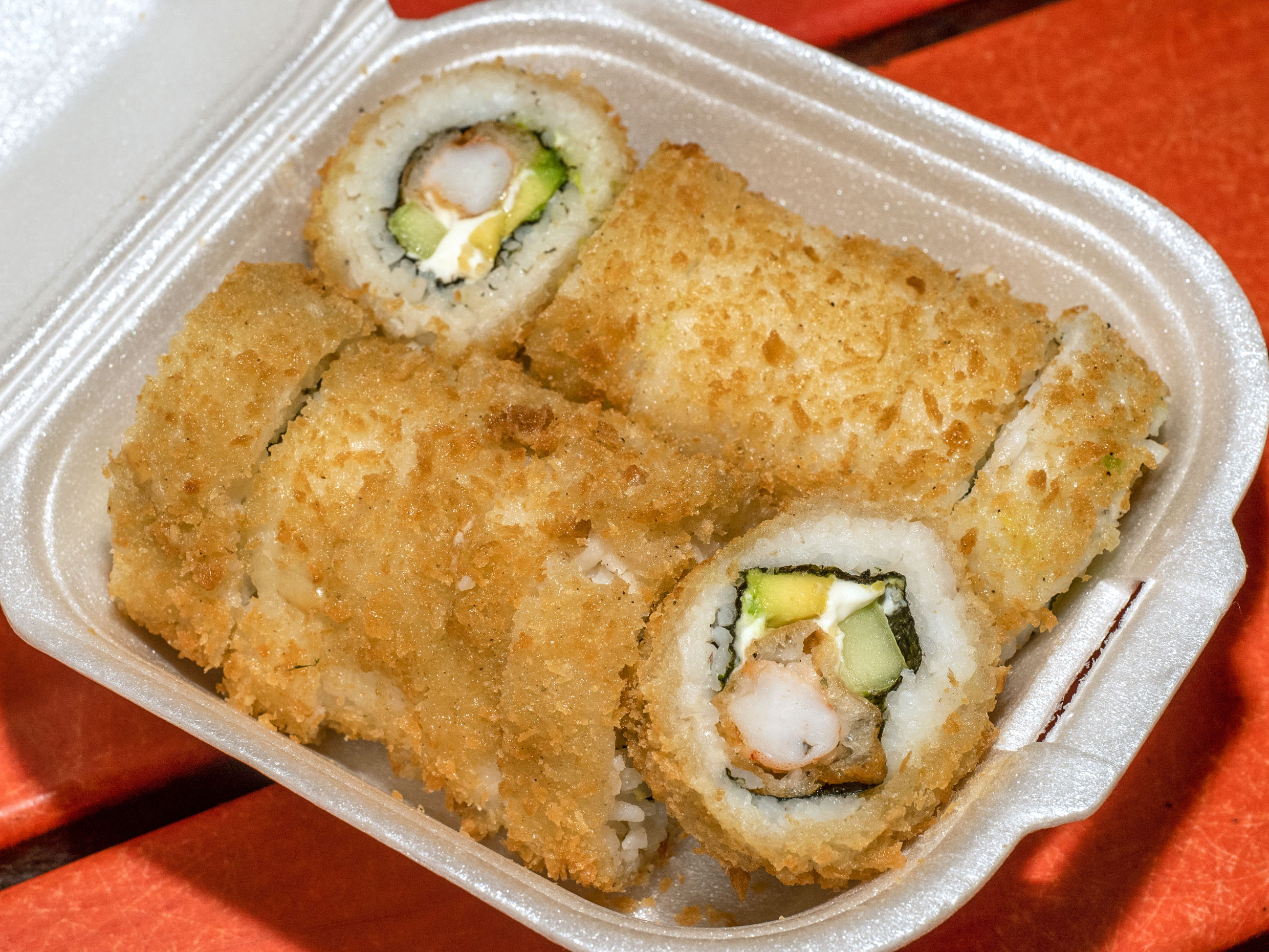 Sushi elaborado con pepino, queso crema, aguacate e ingrediente a elegir acompañado de arroz frito