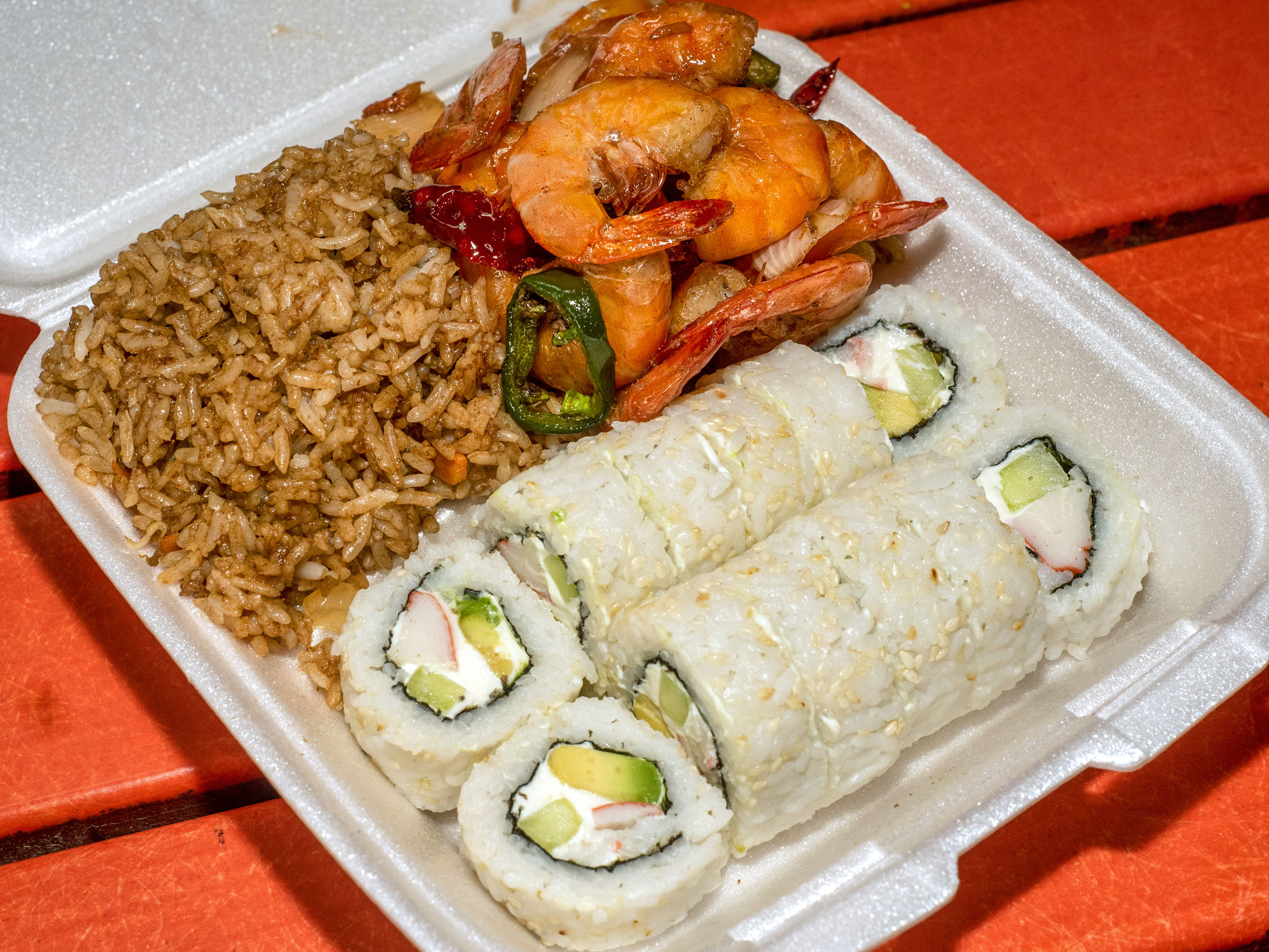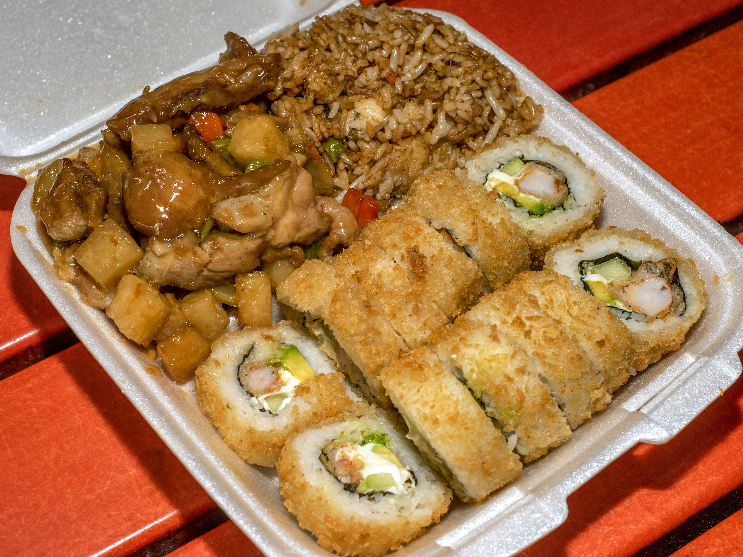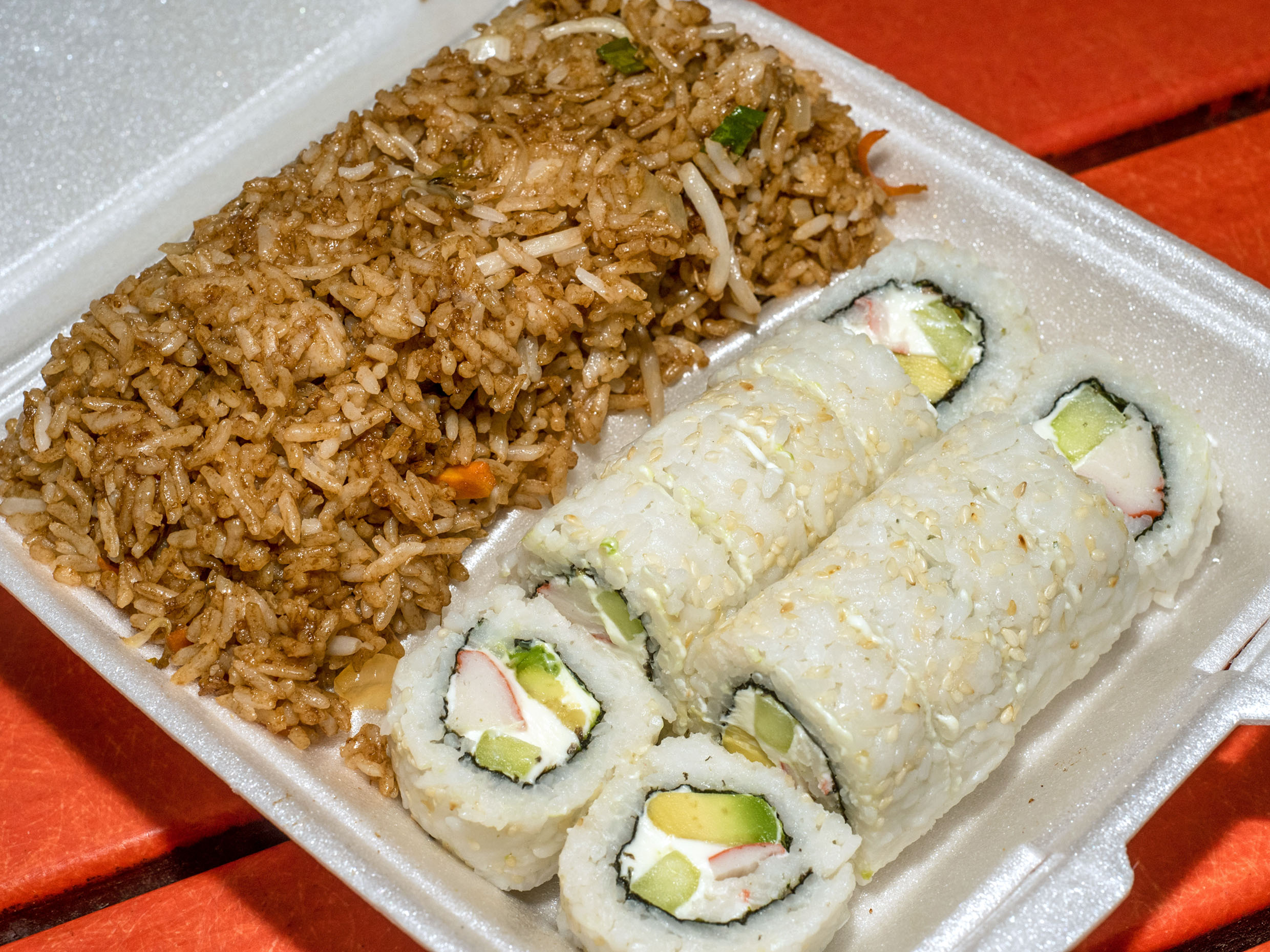 Sushi elaborado con pepino, queso crema, aguacate e ingrediente a elegir acompañado de arroz frito y tu guiso favorito de res, pollo o puerco