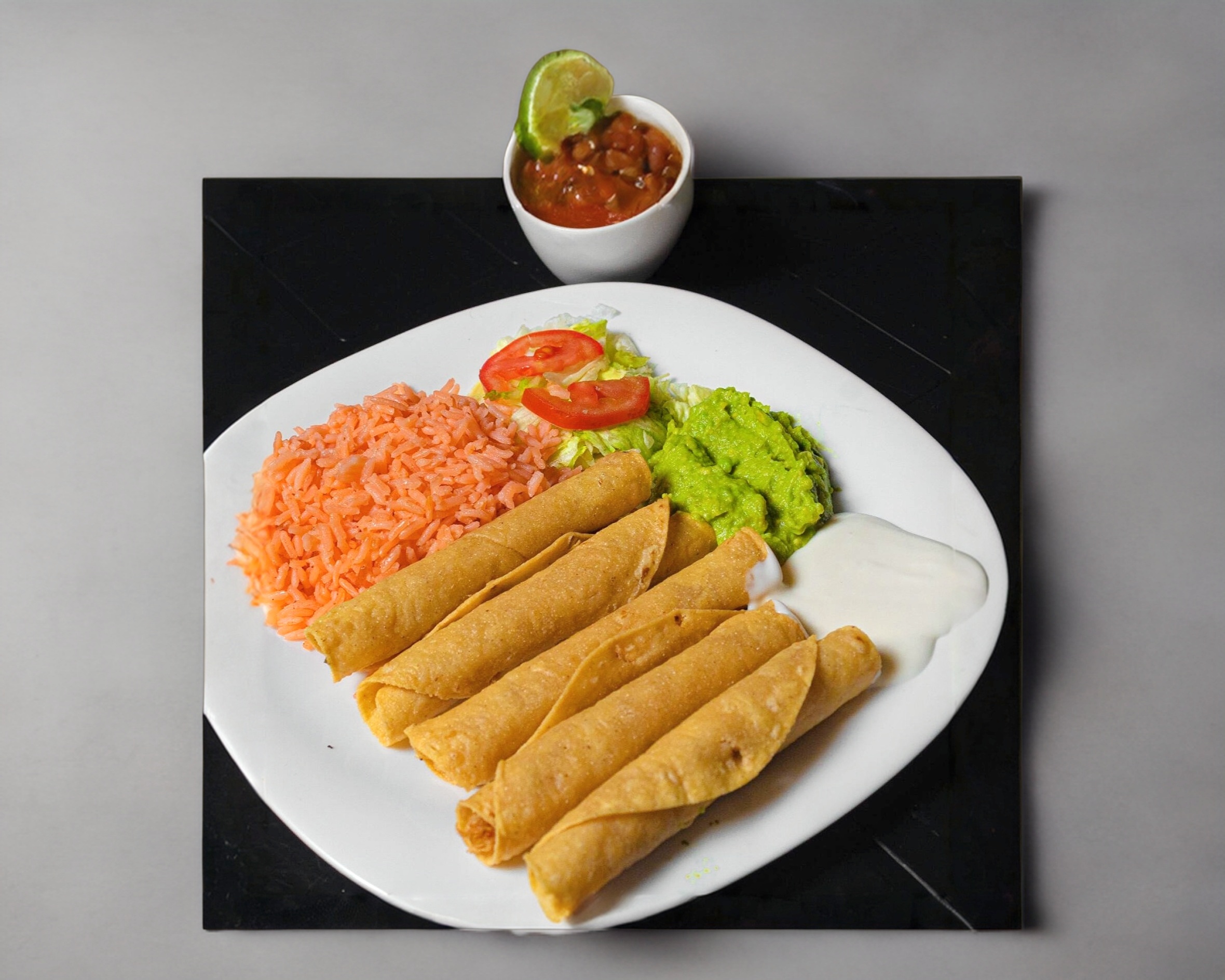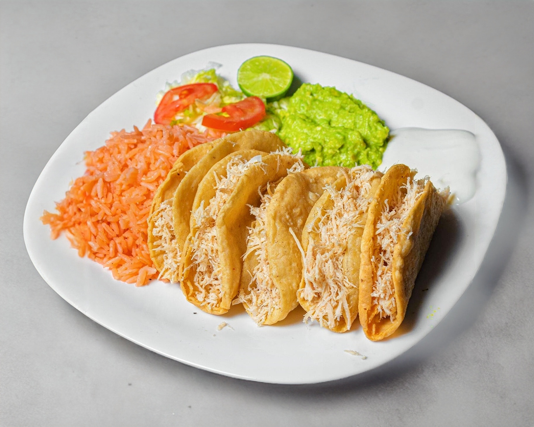 5 Tacos Dorados, arroz, aguacate, crema y ensalada de verduras.