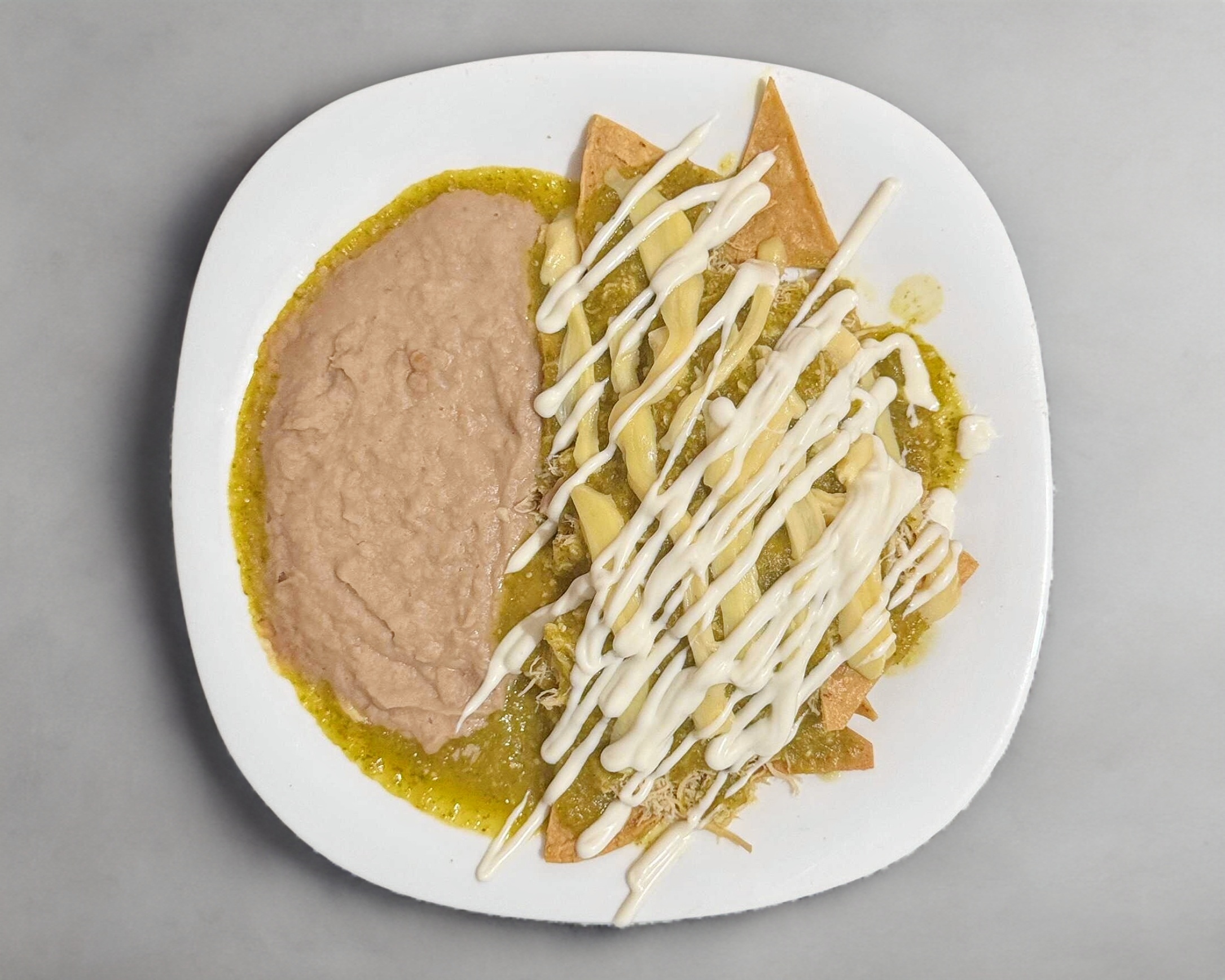 Salsa verde, pechuga de pollo, queso, crema, totopos y frijoles.