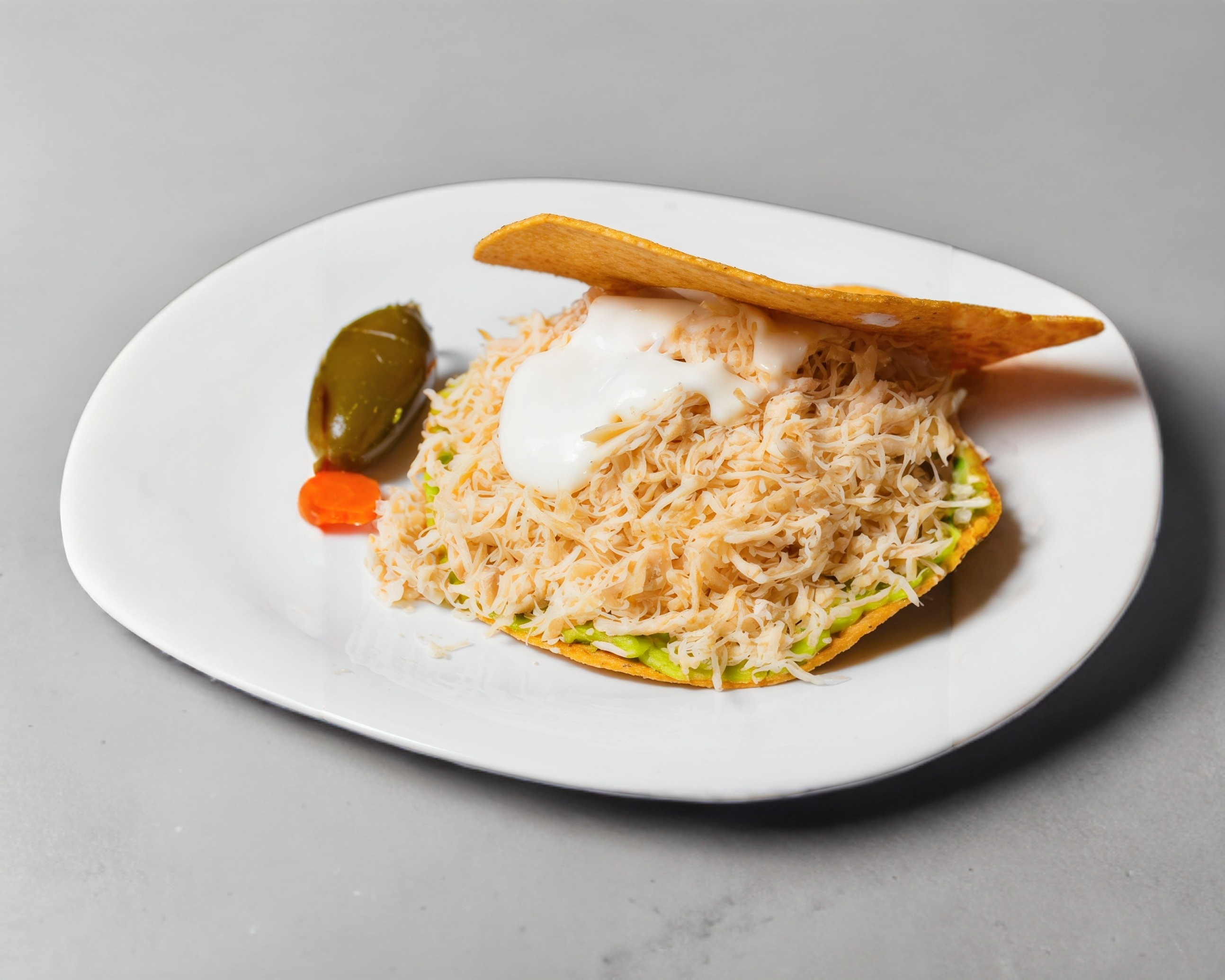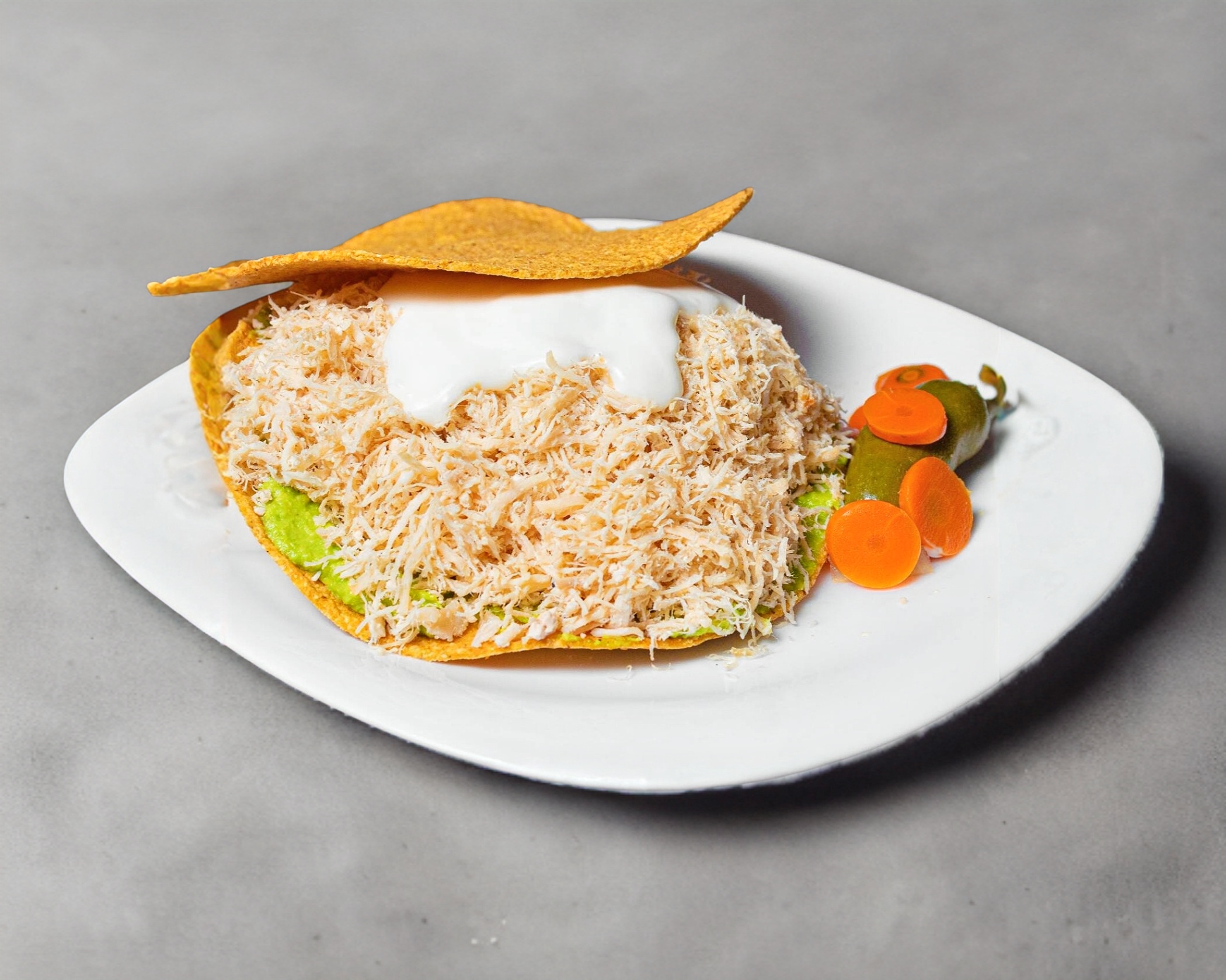 Tostada de pechuga de pollo, con aguacate, crema y chiles.