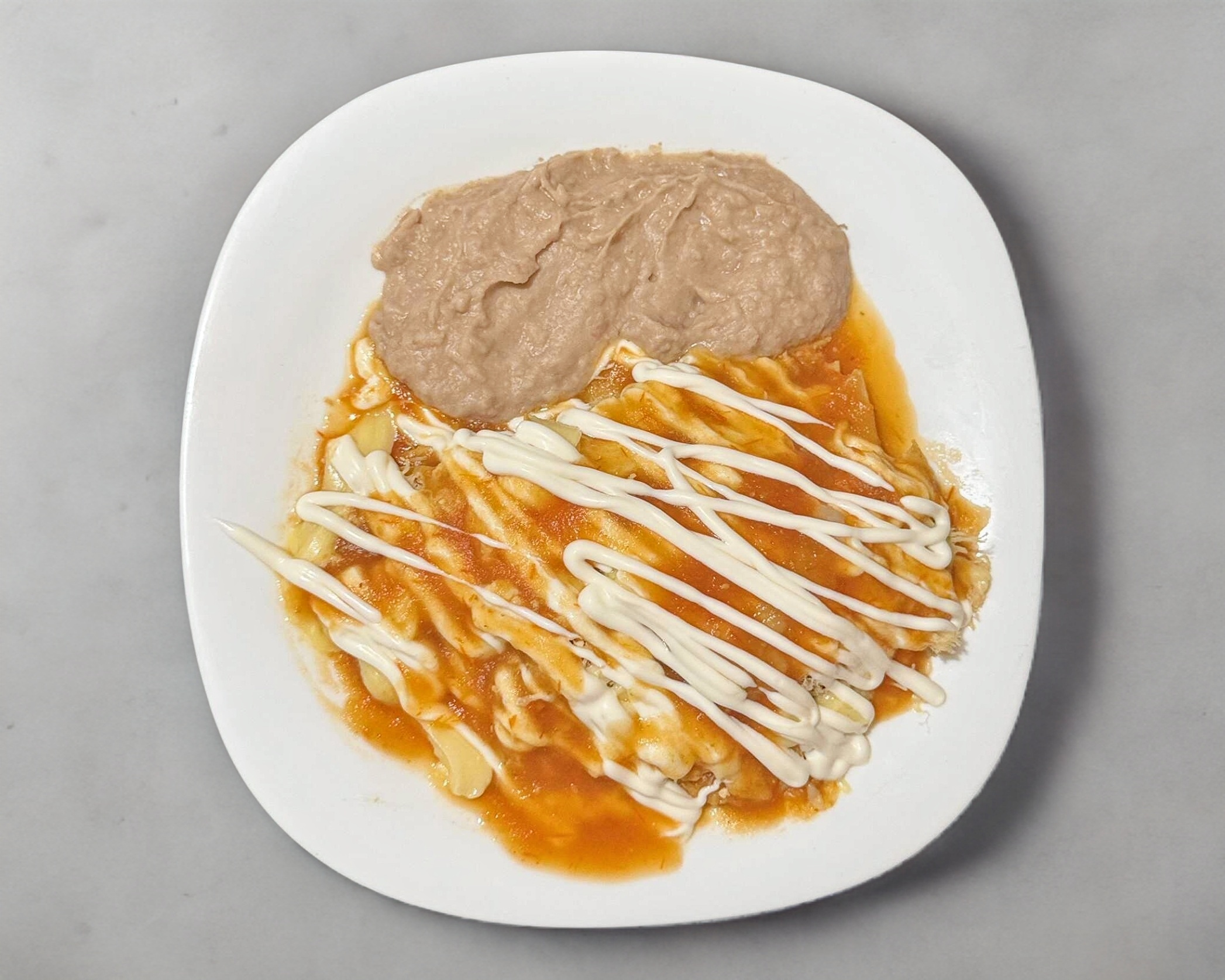 Salsa roja, pechuga de pollo, queso, crema, totopos y frijoles.