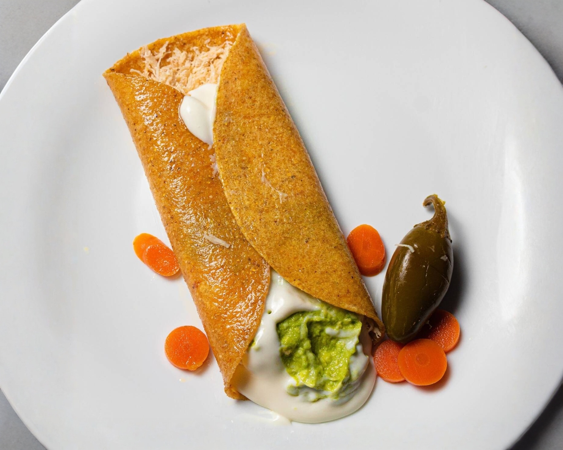Taco especial de pechuga de pollo, aguacate y crema.