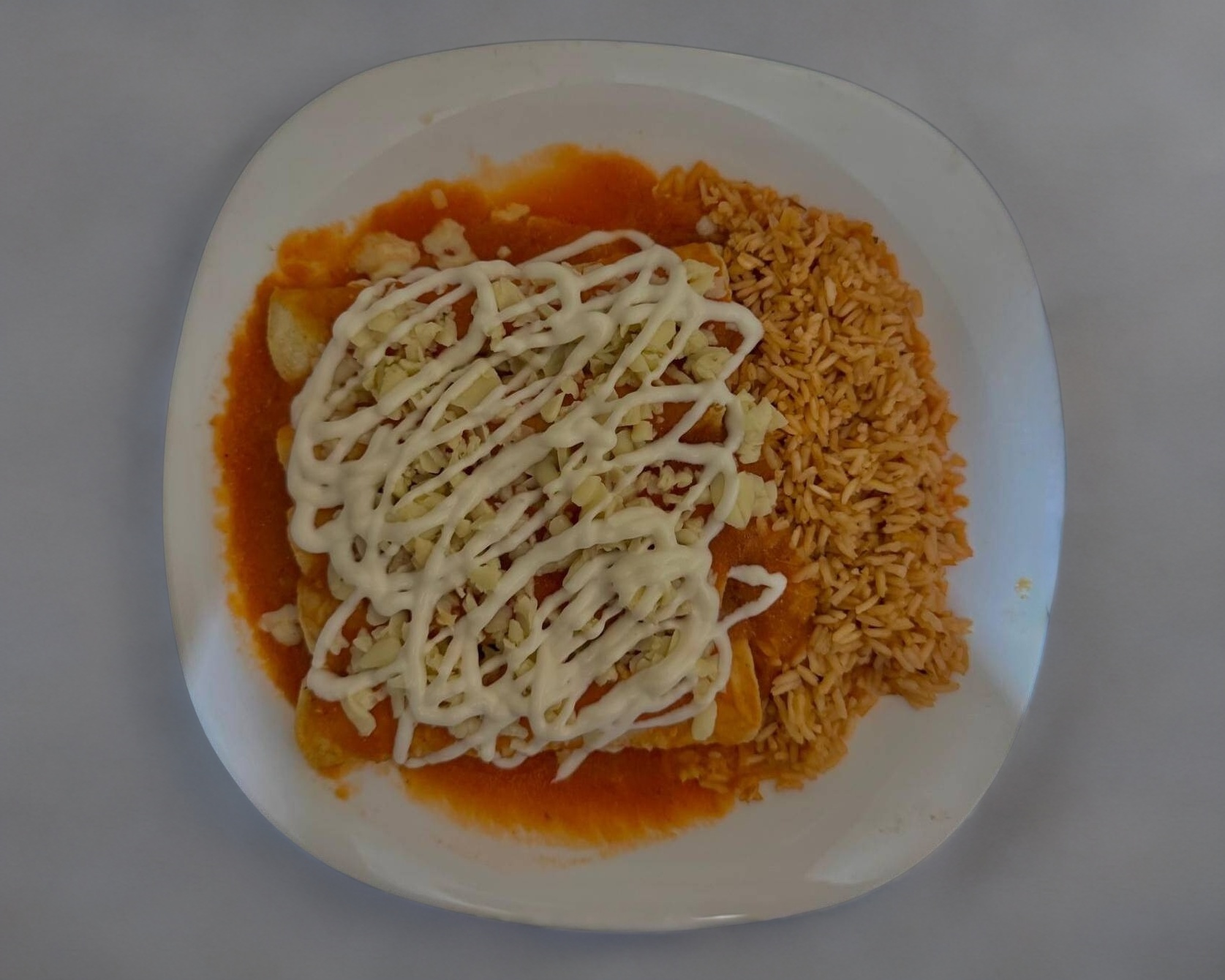 5 Taquitos enrollados con pechuga de pollo, bañados en salsa roja, queso y arroz.