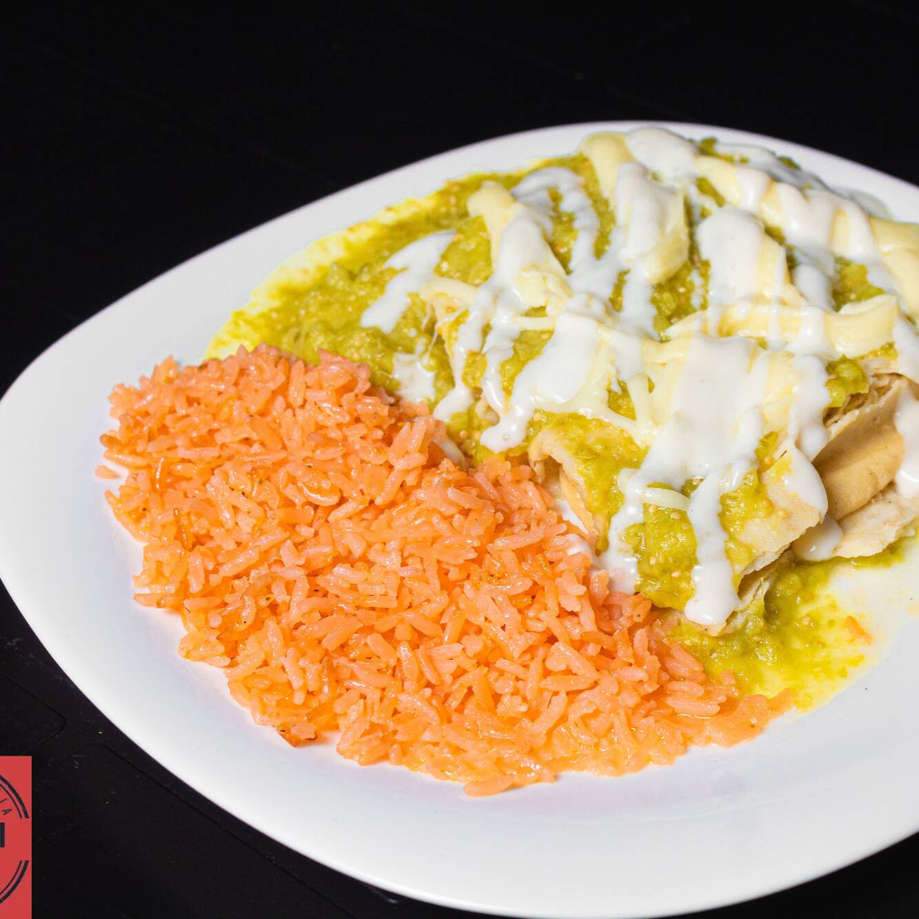 Salsa verde no picante, queso, arroz y crema.