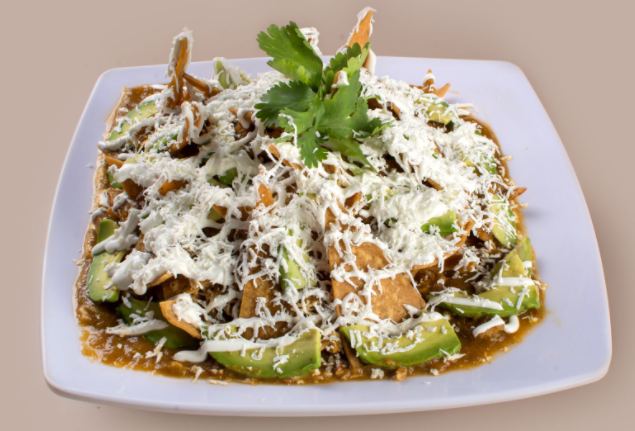 Tortilla frita, pechuga deshebrada, aguacate, queso, crema, salsa verde o roja.