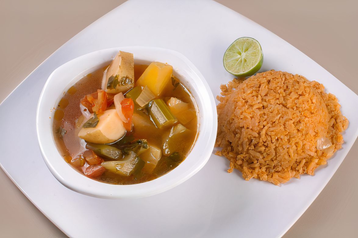 Pechuga deshebrada, verdura, arroz, 1 tortilla ch , limón y jalapeño.