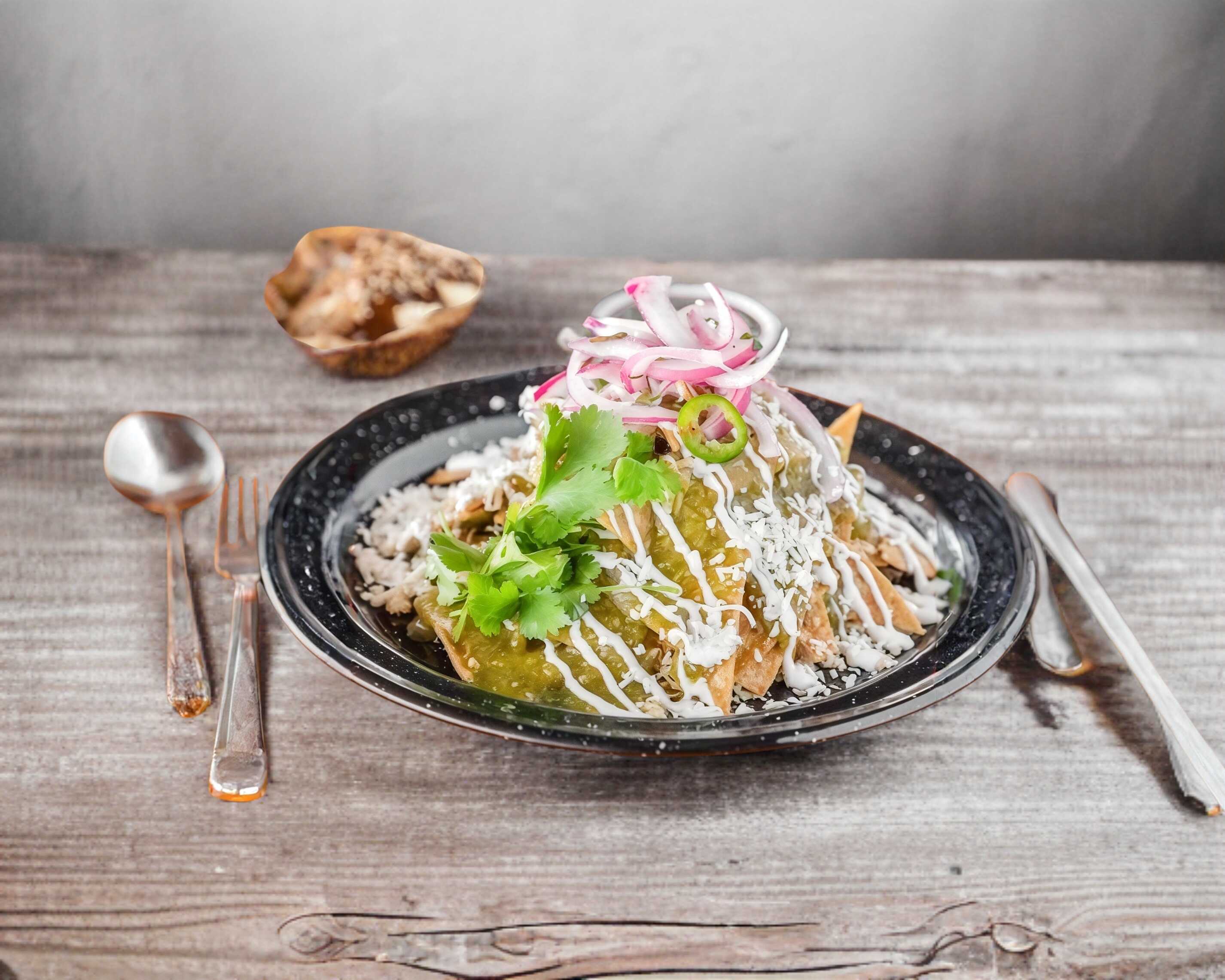 Tortilla frita, pechuga deshebrada, aguacate, queso, crema, salsa verde.