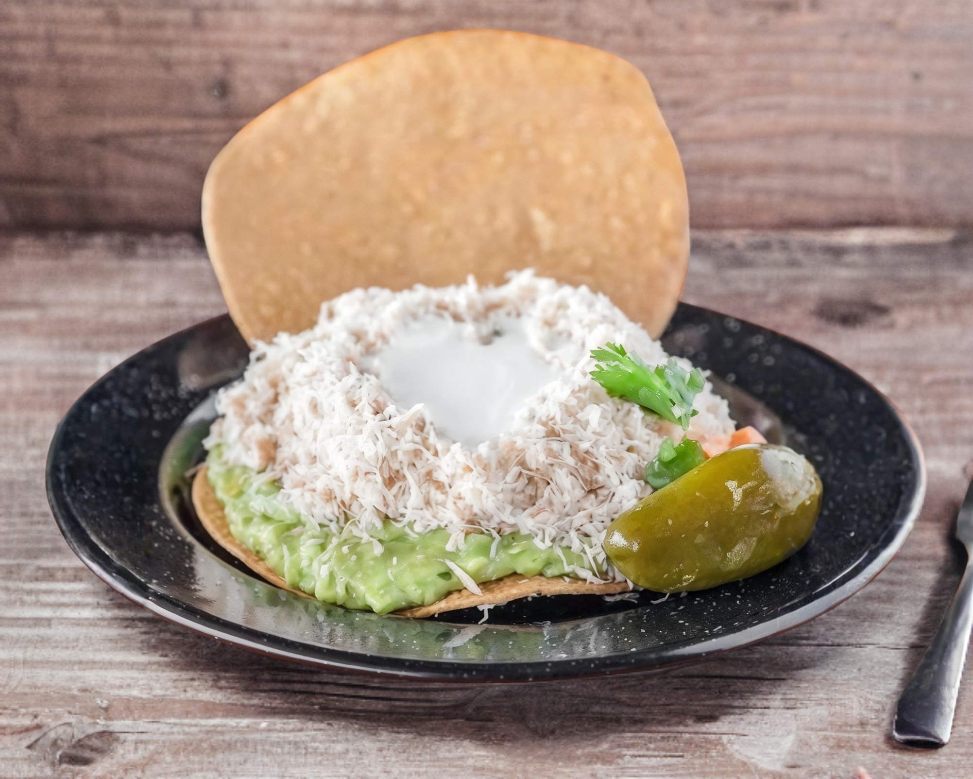 Pechuga deshebrada, guacamole, crema, tortilla gde frita y jalapeño.