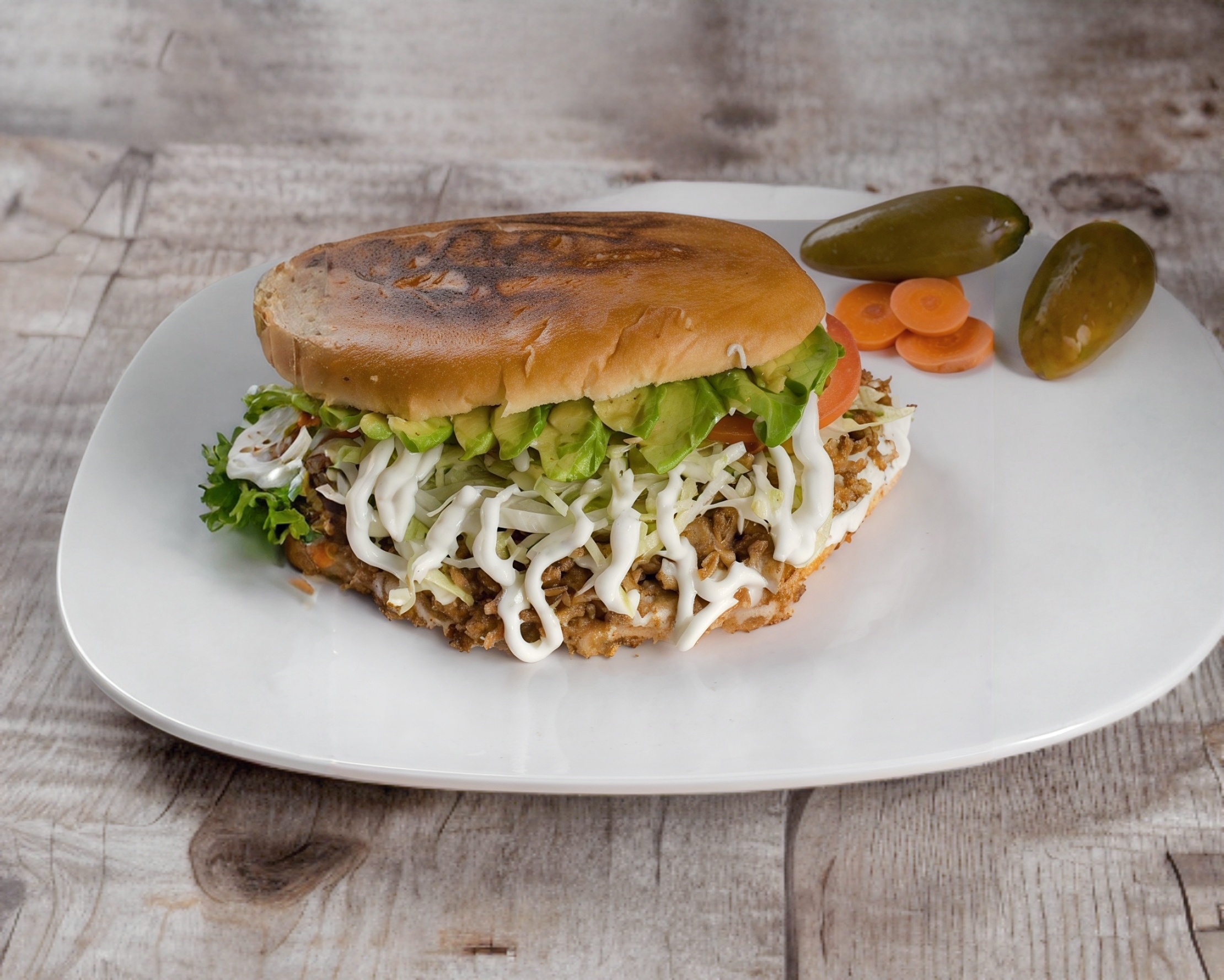 Pan, pierna y muslo, aguacate, crema, lechuga, tomate y jalapeño.