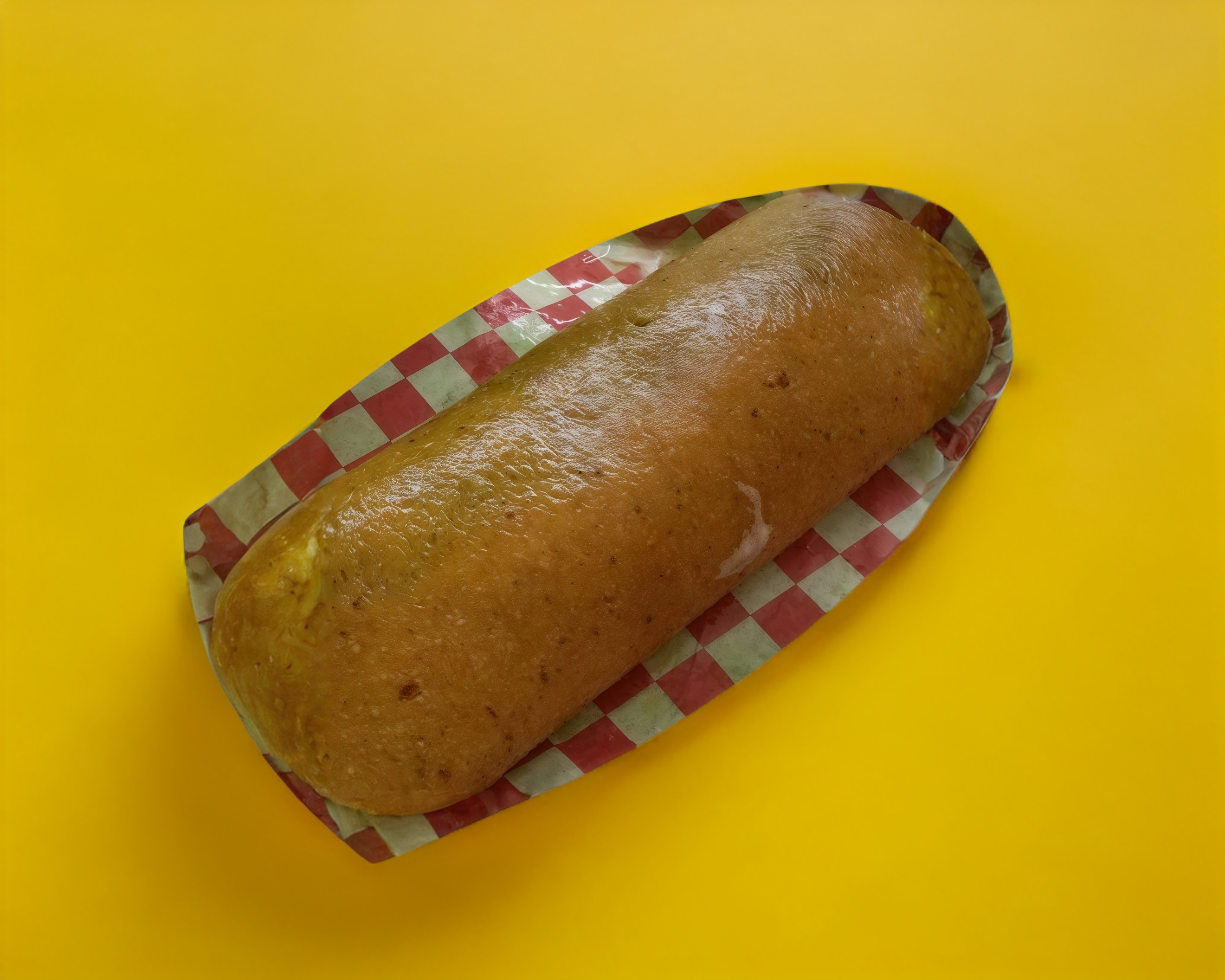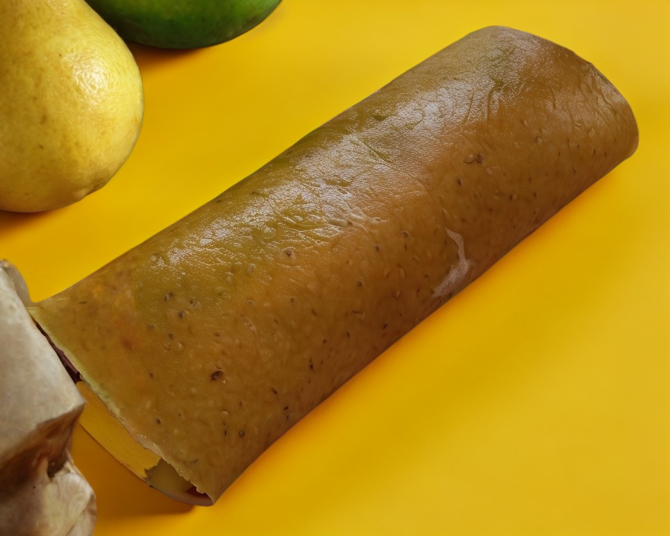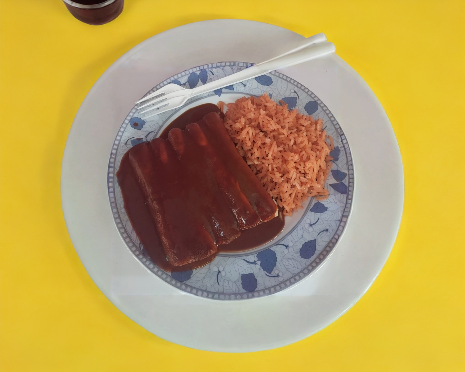 Taco grande de tortilla tipo Siberia, relleno de pollo, bañado en mole de la casa, acompañado de arroz