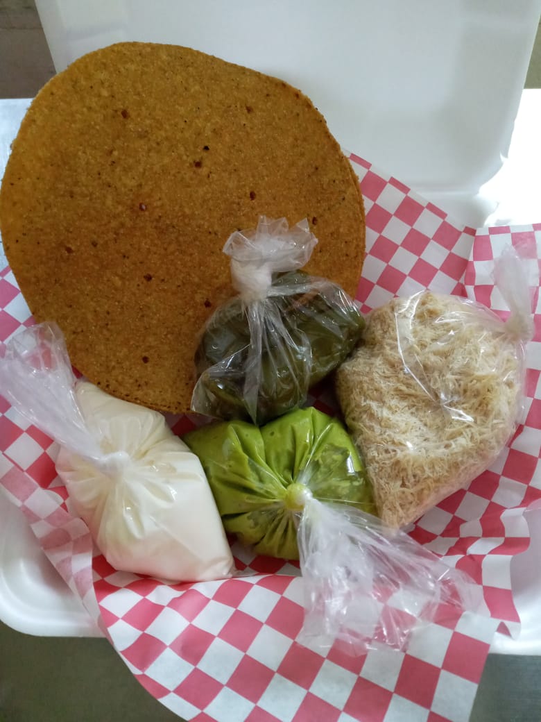Tostada especial: 2 tapas de tostadas grandes con guacamole, pollo y crema. Los ingredientes se entregan en contenedores separados.