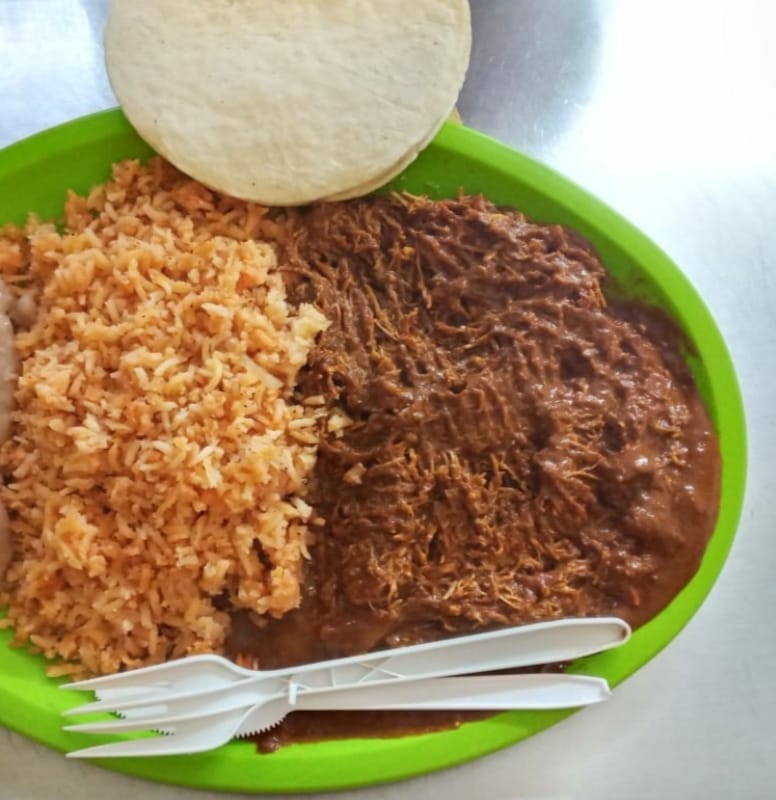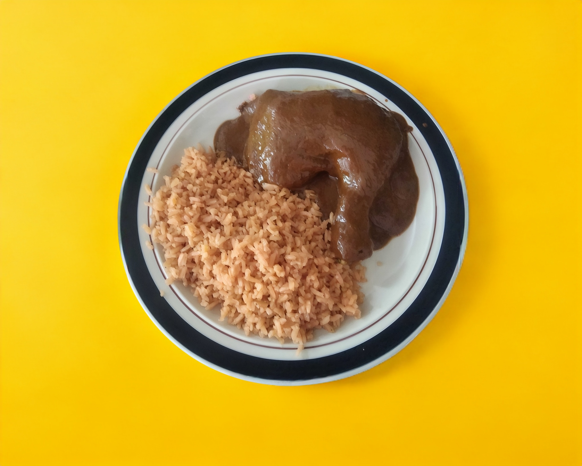 Pollo en mole acompañado de arroz, tortillas y salsa.