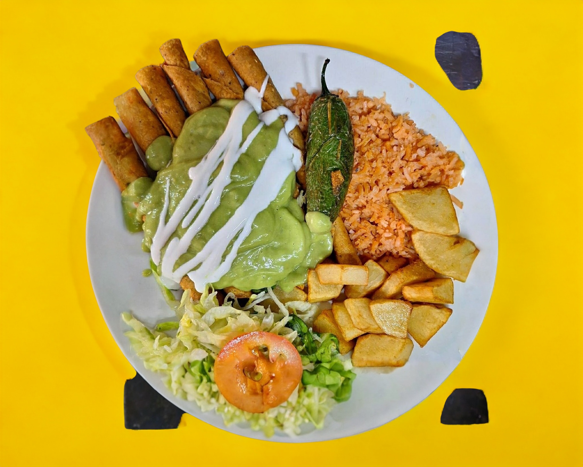 5 flautas de pollo, acompañado de arroz, ensalada de lechuga, Guacamole y crema.