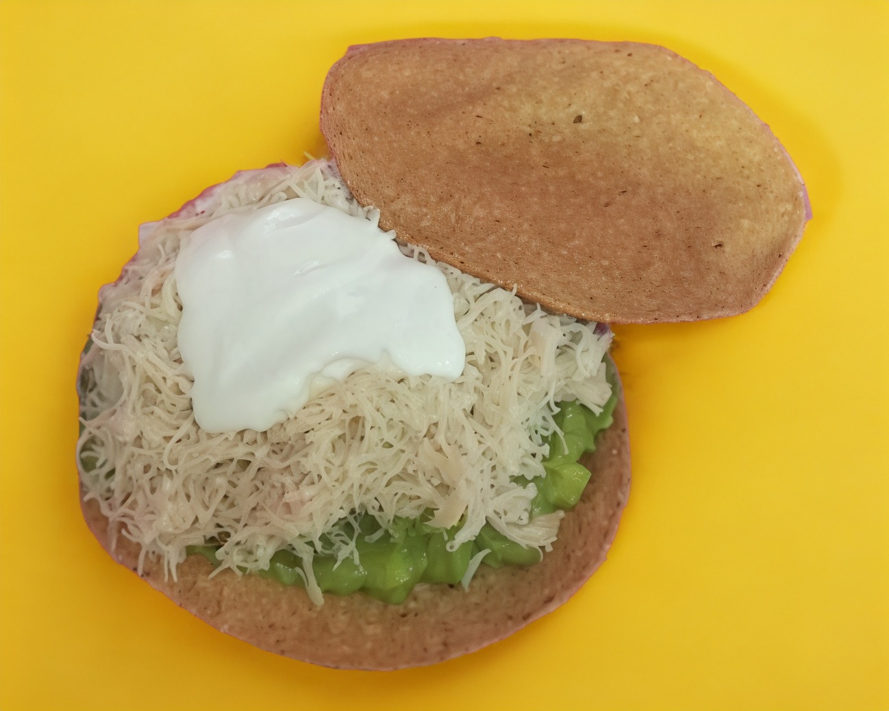 Tortilla chica Siberia acompañada de guacamole, pollo y crema.