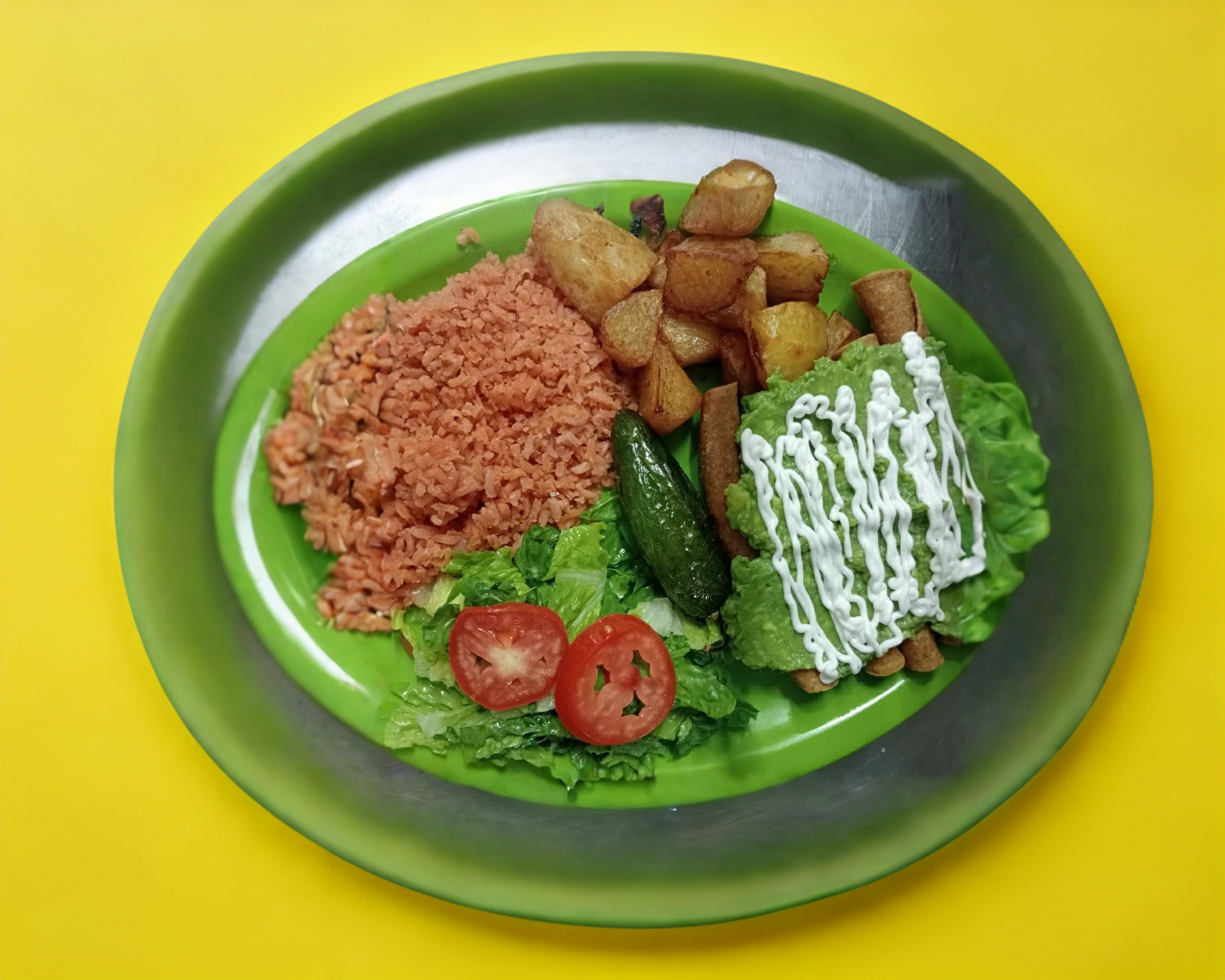 Pierna Frita, acompañada de Arroz, guacamole, crema, ensaladas de lechuga y 3 tapas de tostada Jr.