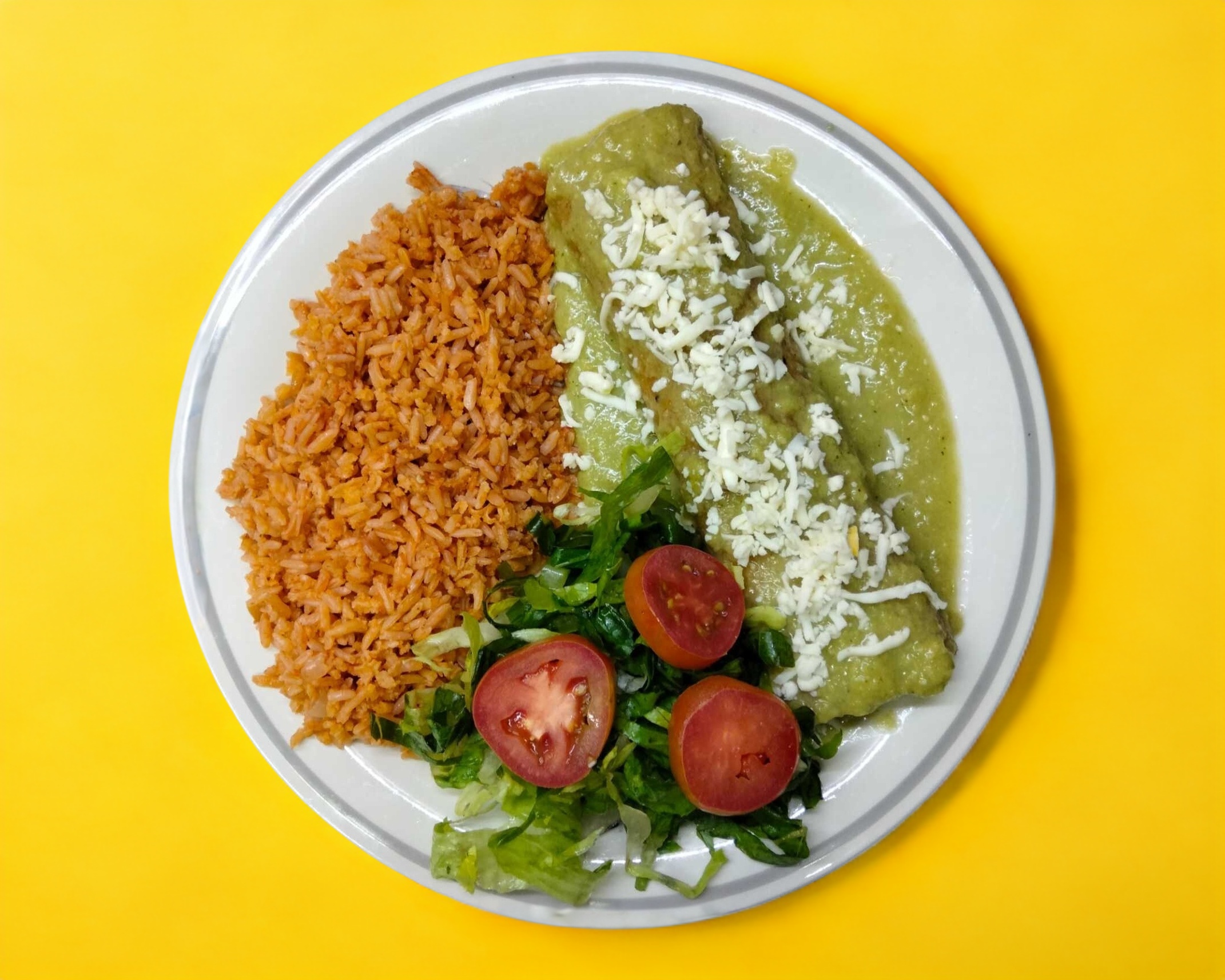 5 piezas de Enchiladas en tortilla Roja, acompañadas de papa com Zanahoria, arroz, chile toreado, lechuga con Tomate
