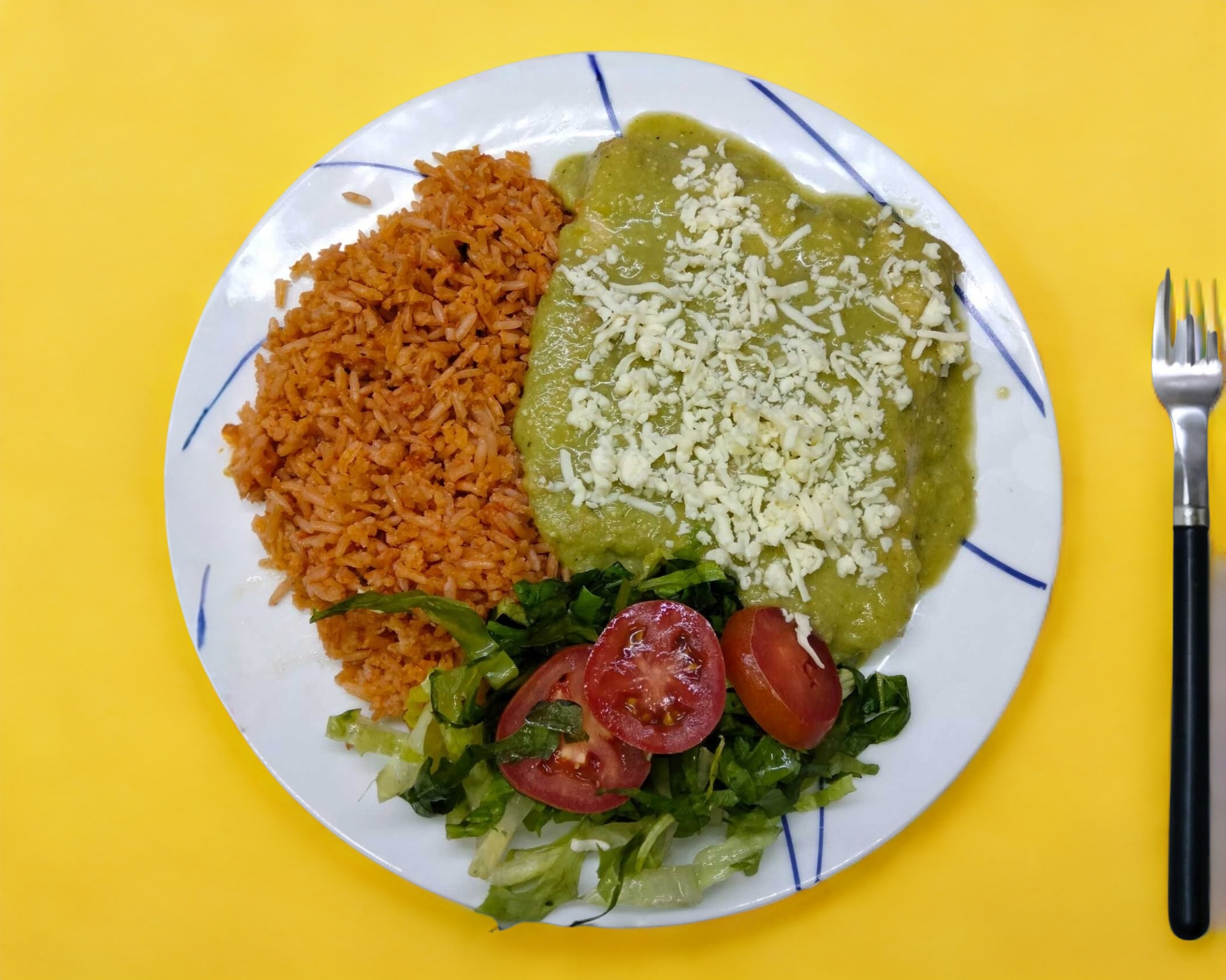 Orden con 5 tacos de tortilla de maíz rellenos con pollo, bañados con salsa verde, queso asadero y crema. Acompañado de arroz y ensalada de lechuga con tomate. (Porción personal)