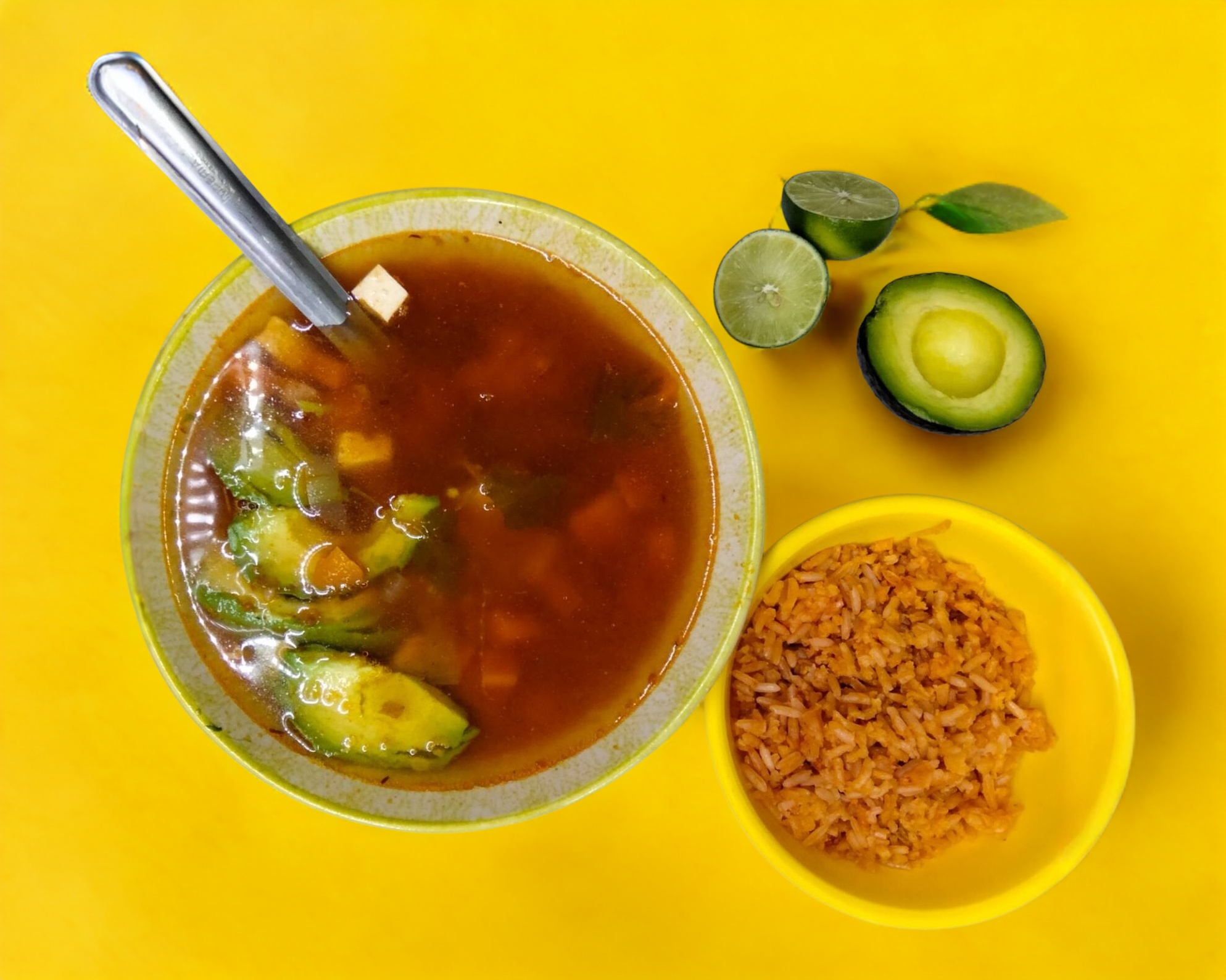 Caldo de pollo con variedad de verduras, arroz, tortillas y salsa.