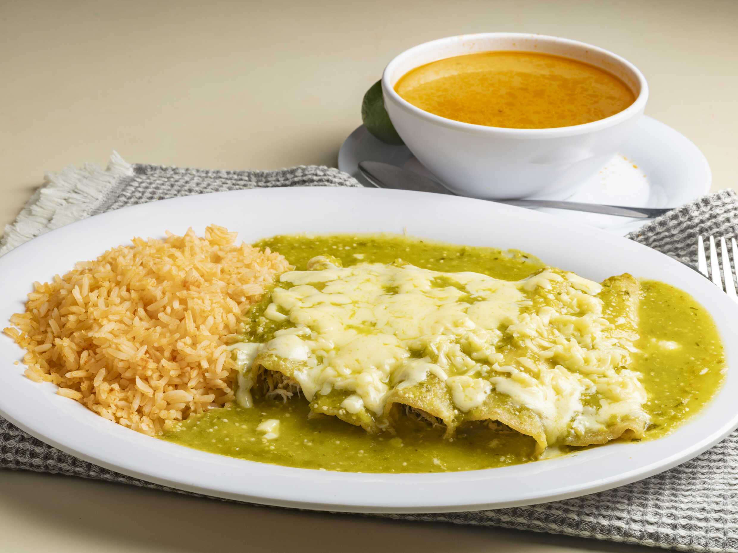 Enchiladas Suizas de pechuga (5 pzas), arroz y conzomé
