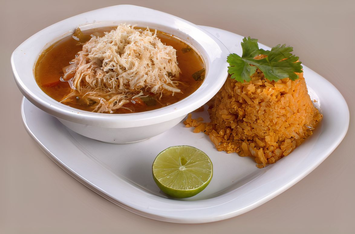 Pechuga deshebrada, guacamole, crema, tortilla gde. Frita y jalapeño, caldo con verdura y pechuga deshebrada.