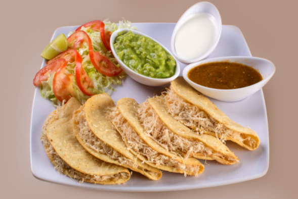 Tortilla frita, pechuga deshebrada, aguacate, queso, crema, salsa verde o roja.