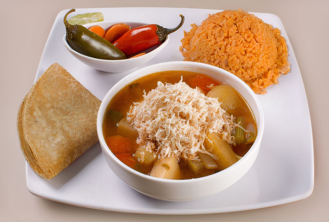 Pechuga deshebrada, guacamole, crema, tostada, tortilla gde. Frita, jalapeño, caldo con verdura y pechuga deshebrada.