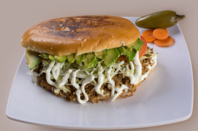 Pan, pierna y muslo, aguacate, crema, lechuga, tomate y jalapeño.