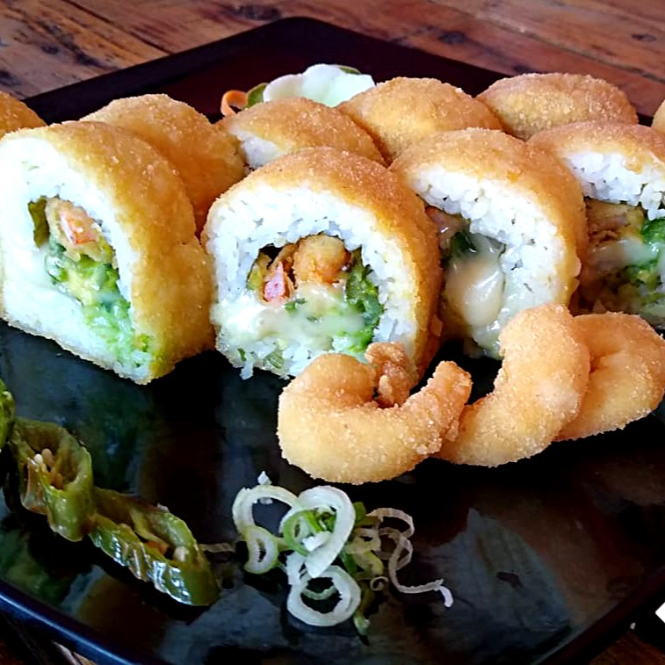 Rollo cubierto con camarón empanizado relleno de cangrejo, tampico y aguacate.