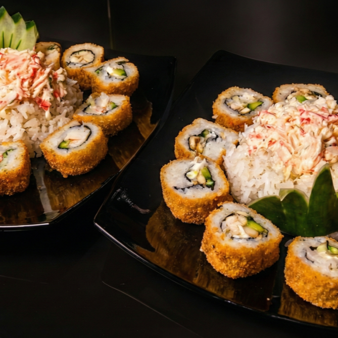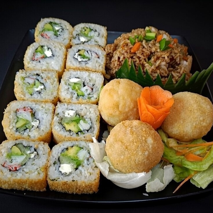 2 Rollos California (Fríos) o Empanizados a tu elección de Camarón | Res | Pollo | Tampico | Cangrejo | Trompo | Pescado + Arroz Yakimeshi Especial (Con Aguacate y Queso Crema) + 2 Brochetas de Queso Manchego