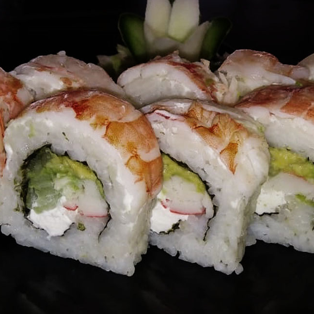 Cubierta de camarón más un relleno de queso philadelphia, aguacate, cangrejo y pepino.
