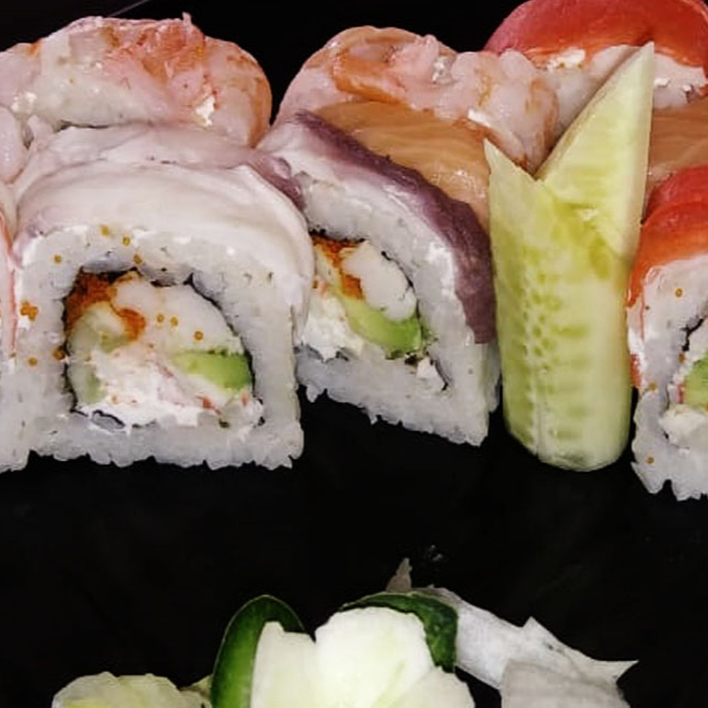 Rollo cubierto con camarón, salmón, pulpo, cangrejo, ademas aguacate, queso, y surimi por dentro.