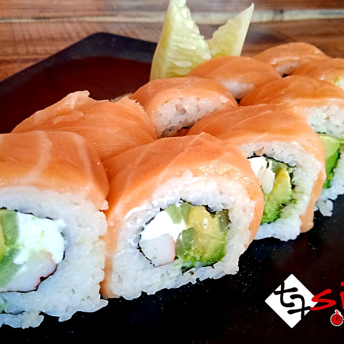 Cubierta de Salmón con un relleno de Queso Philadelphia, Aguacate, Pepino y Cangrejo.