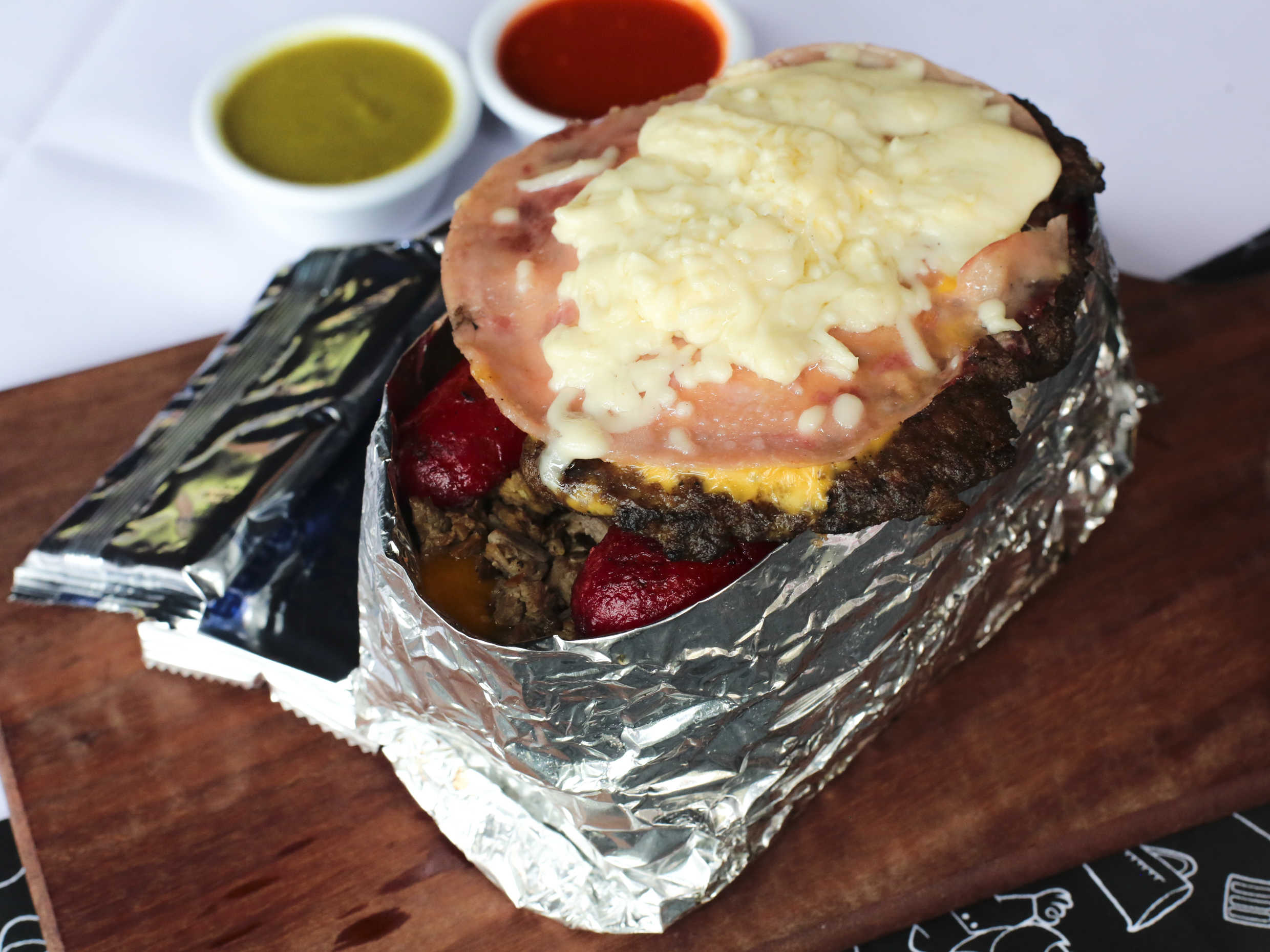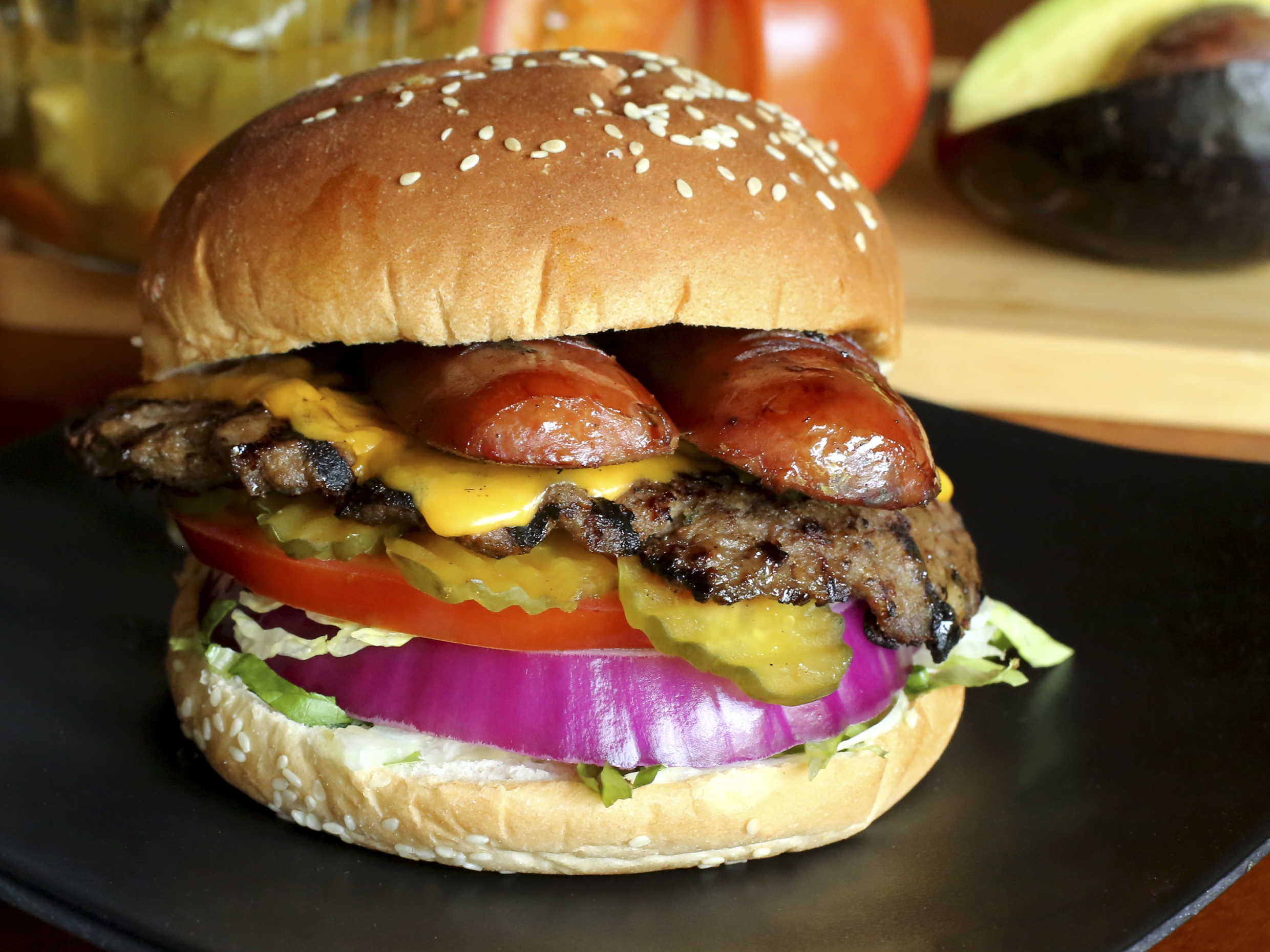 Hamburguesa de res con nuestra receta especial , salchicha asada , queso , jamón ,aguacate , lechuga , tomate , cebolla y pepinillos.