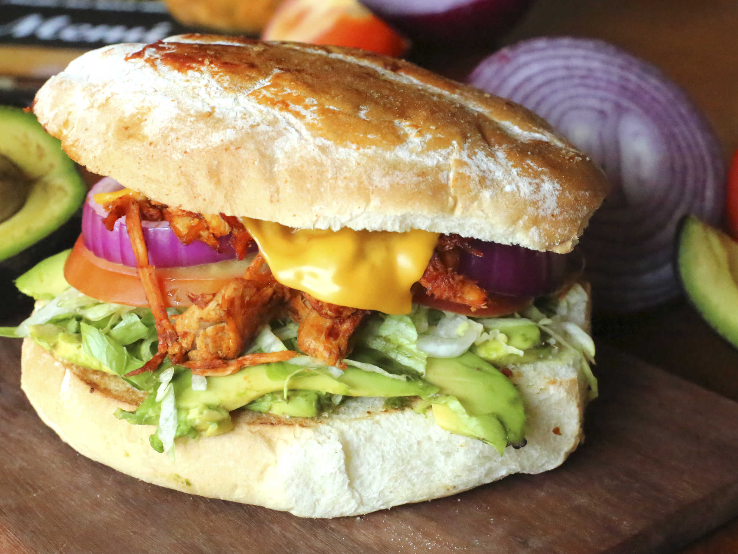 Delicioso pan artesanal , con aguacate , lechuga , tomate , cebolla nuestra exquisita carne deshebrada sazonada con chile colorado , queso y crema.