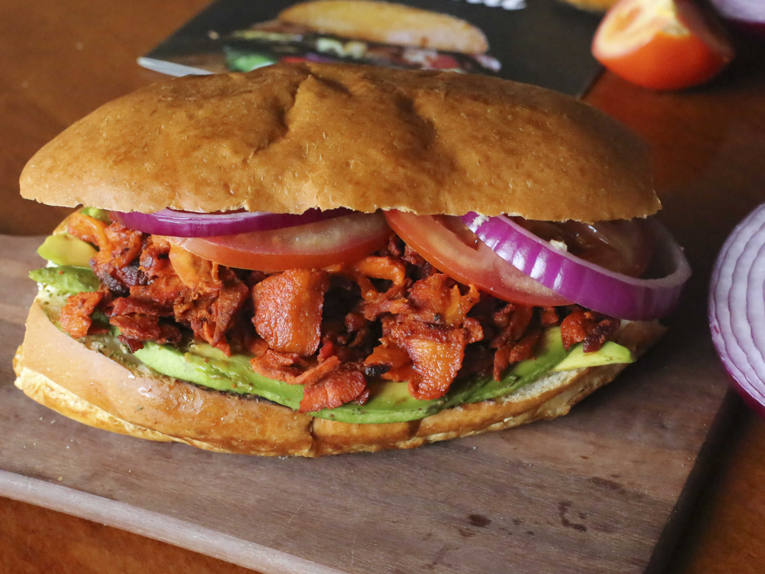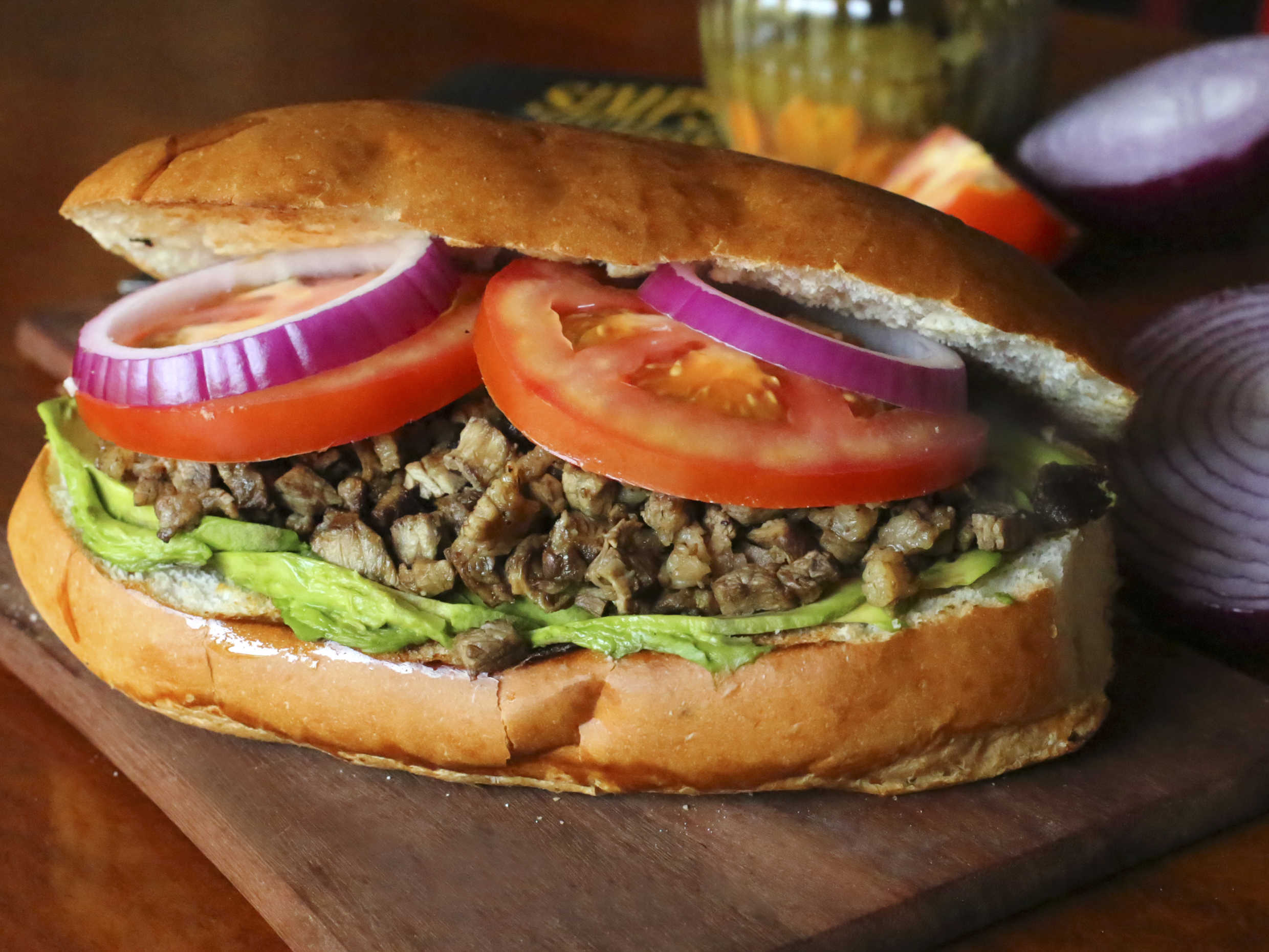 Torta de pan artesanal con aguacate, cilantro con cebolla, carne de trompo sazonada en chile rojo y mayonesa.